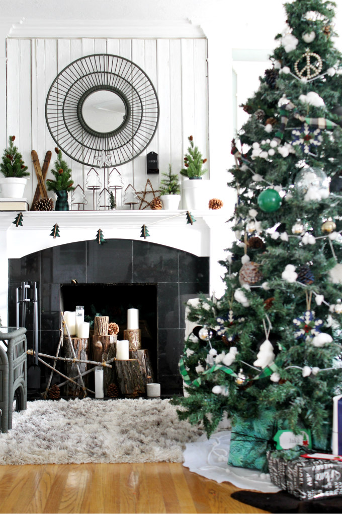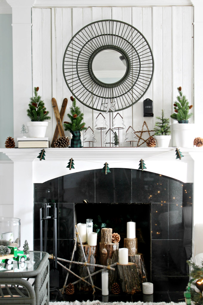 Where I had the most fun in our living room, was decorating the fireplace.  I’ve already shared about the mini trees that I made over HERE, and I’ll be sharing more about my mantel details in an upcoming post.