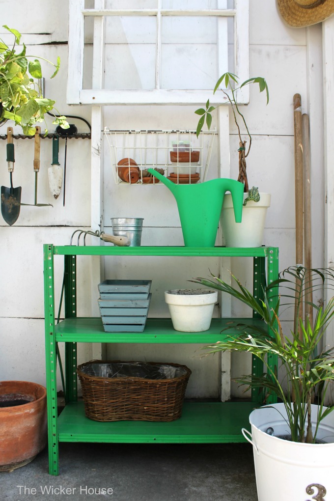 The green shelf has been perfect for storing extra garden pots.