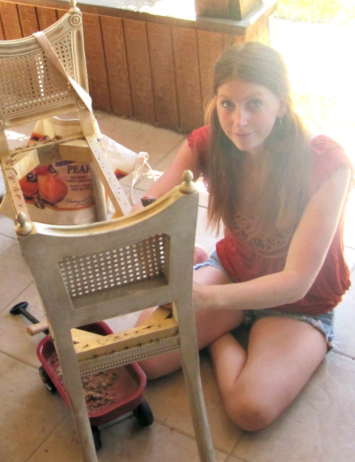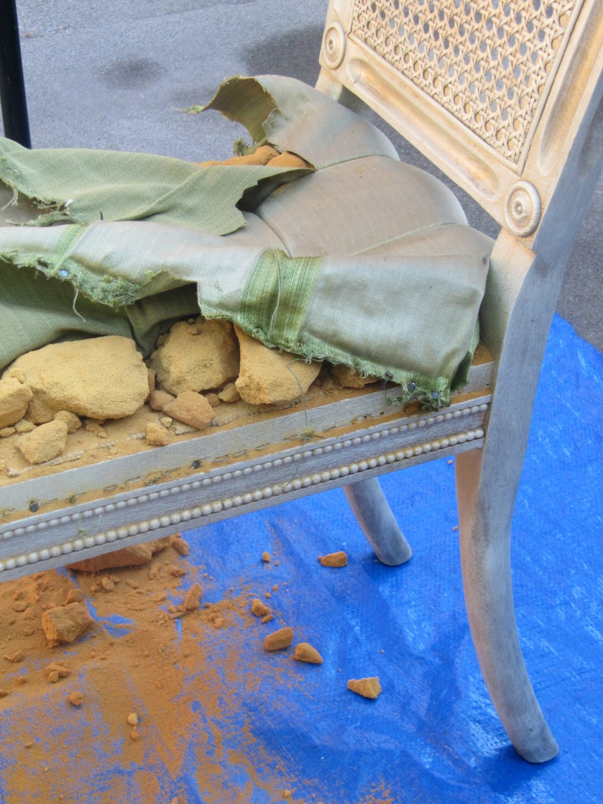 We had started working on the piece together, removing the green fabric. Because it is so old the foam padding had disintegrated and just turned into a dusty mess. It also had a ton of little tacks that we spent hours removing.