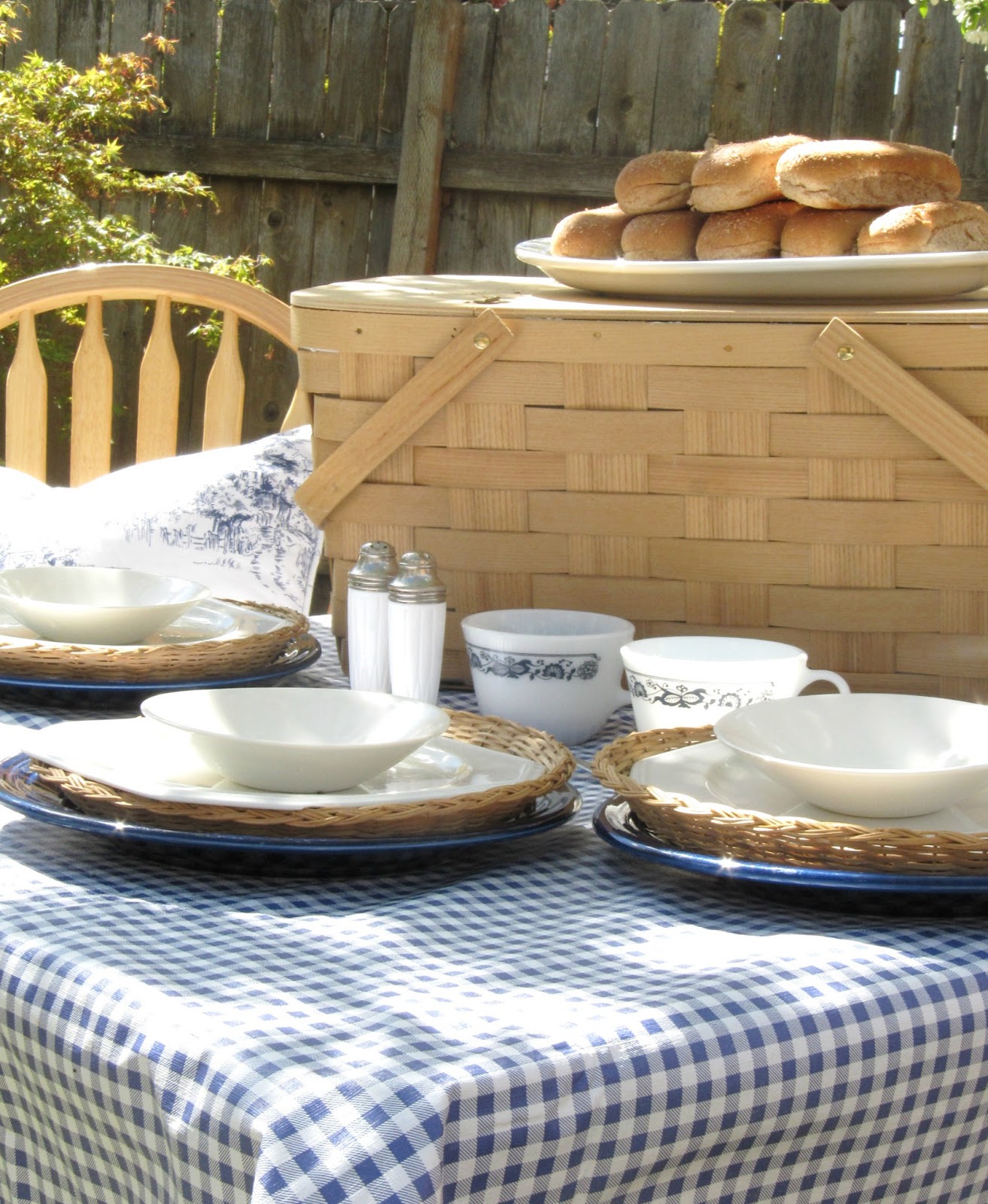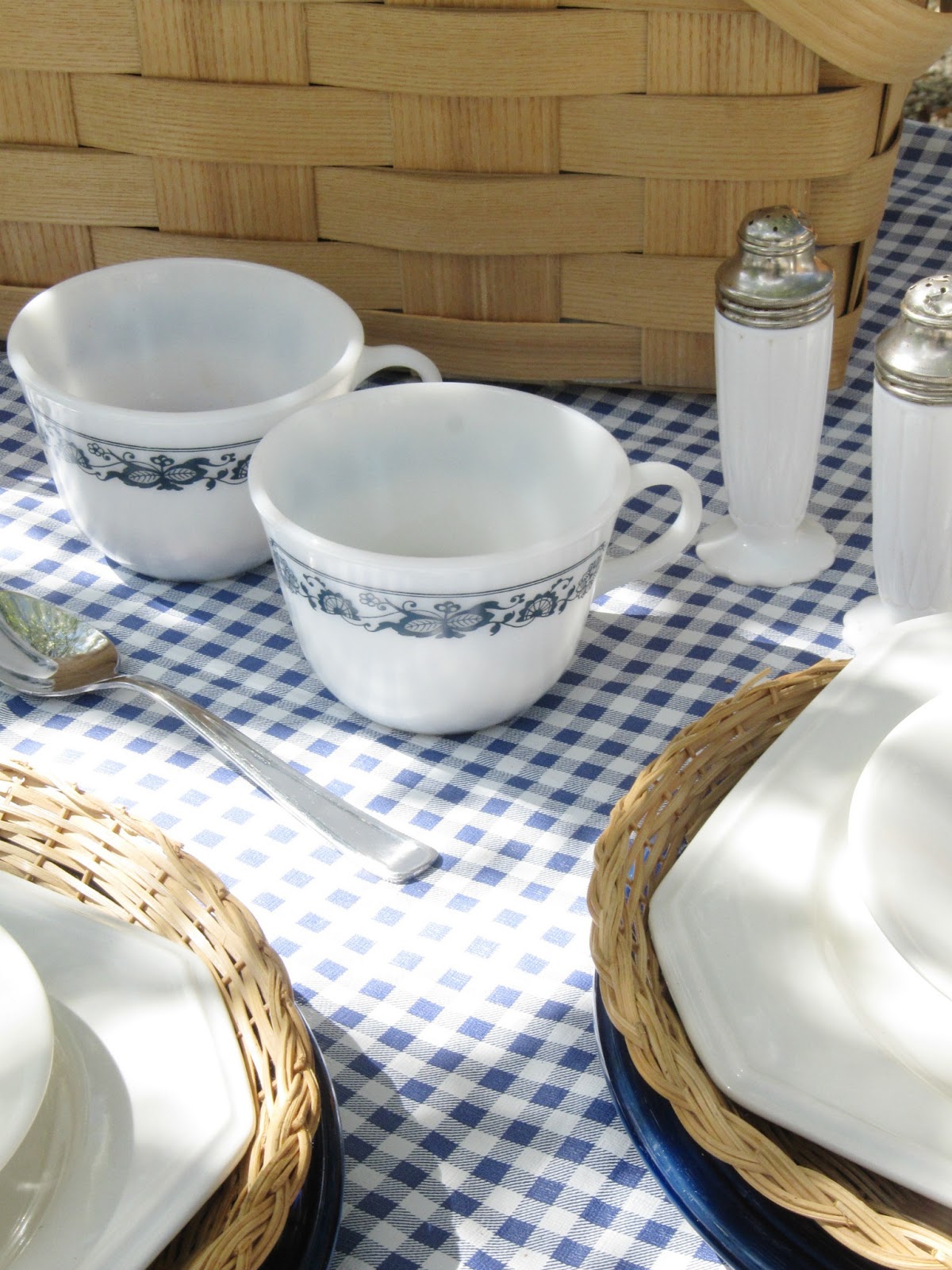 For my table setting, I layered my table with a blue and white gingham table cloth, I then added a stack of blue and white plates with a wicker charger at each setting, because I’ve always gotta have some wicker! 🙂 And then a set of vintage Pyrex tea cups hold the condiments. One for the ketchup and one for the mustard. I think this is such a cute added touch.