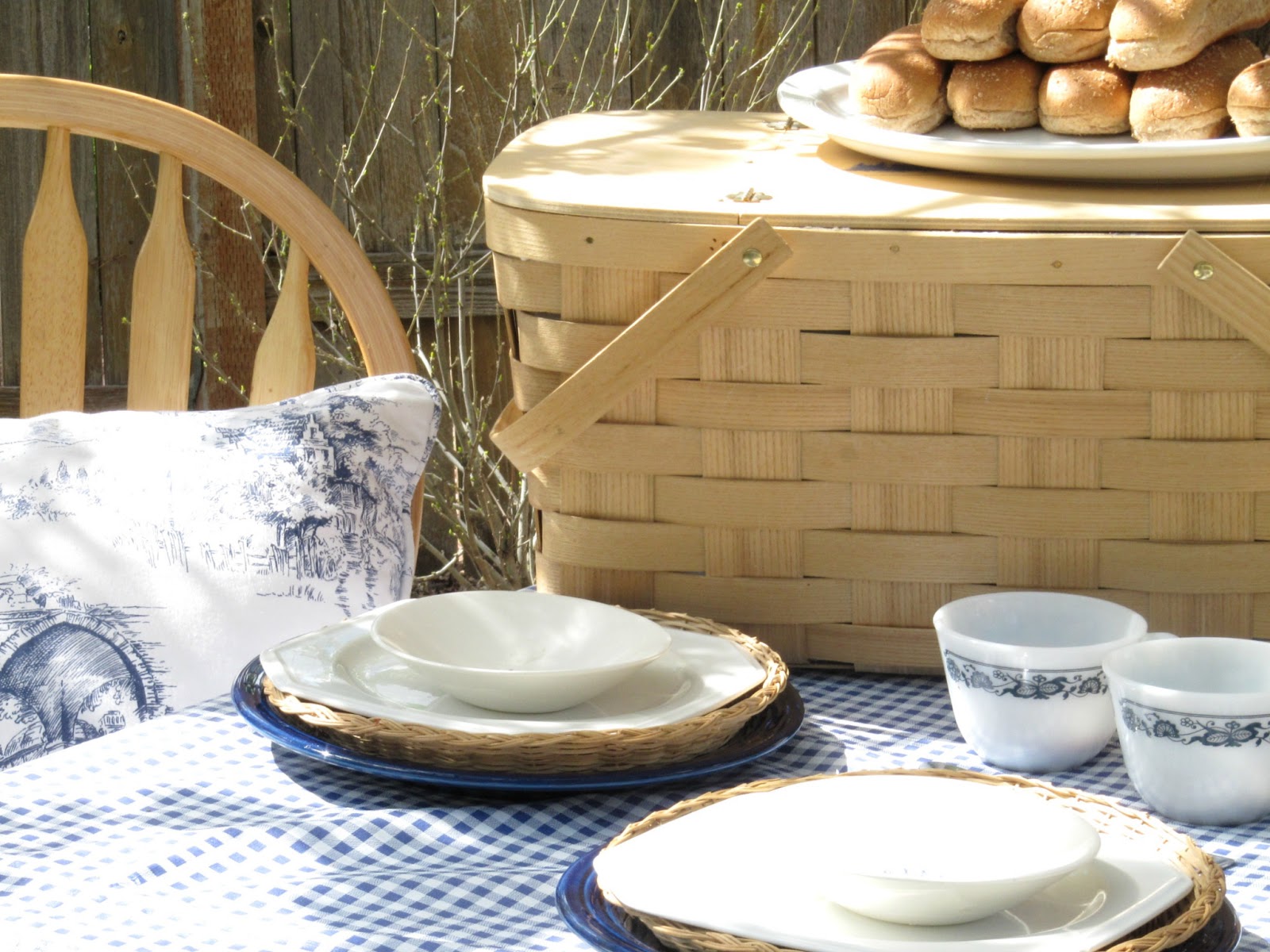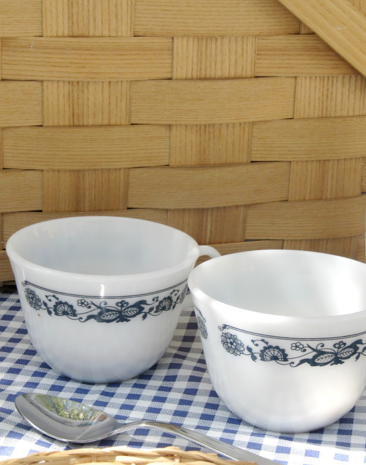 For my table setting, I layered my table with a blue and white gingham table cloth, I then added a stack of blue and white plates with a wicker charger at each setting, because I’ve always gotta have some wicker! 🙂 And then a set of vintage Pyrex tea cups hold the condiments. One for the ketchup and one for the mustard. I think this is such a cute added touch.