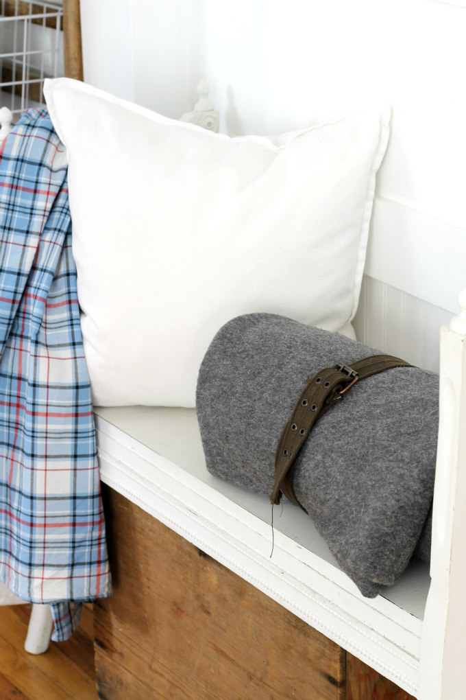 The little white bench is an antique too. I usually just switch out the pillows on it to give it a new look for the changing seasons. I thought the rolled up blanket was a fun touch for fall, it’s something you can grab on your way out the door for watching a football game or having a picnic. It was so simple that you can create one too, just grab a blanket, roll it up and wrap a kids belt around it.