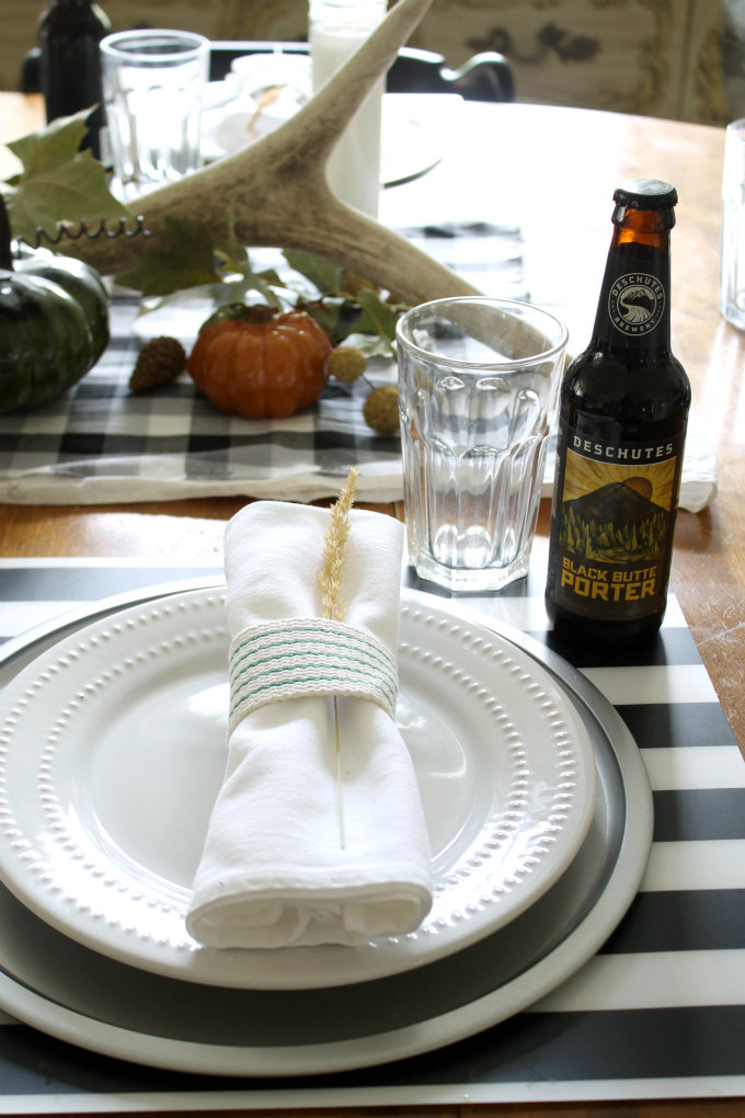 And then for the place settings, I started off with my black and white striped plastic place mats from Ikea that I just Love. If you are near a Ikea, then you need to get you some of these, especially if you have kids. They wipe up so easy and I think they are adorable.