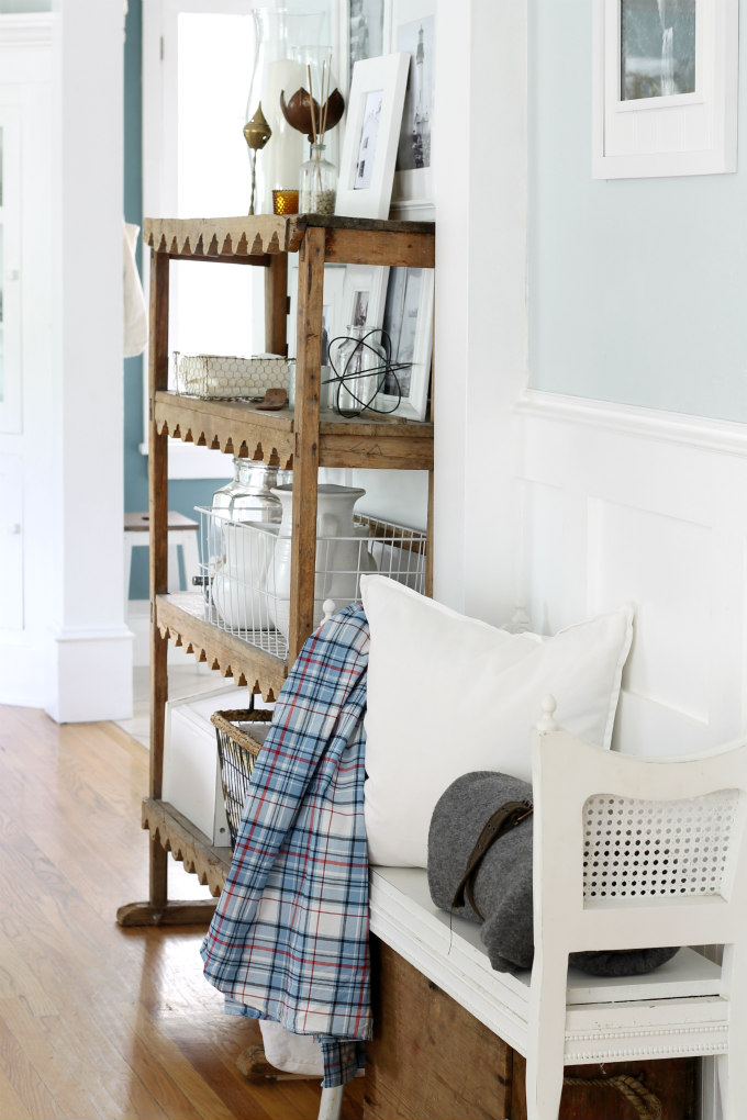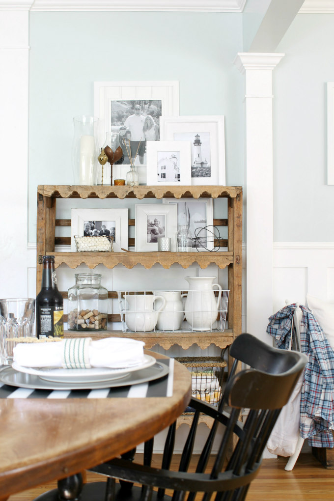 I switch the decor on this antique shelf up often, but the white picture frames and white pitchers are staples. I just love the freshness of white.