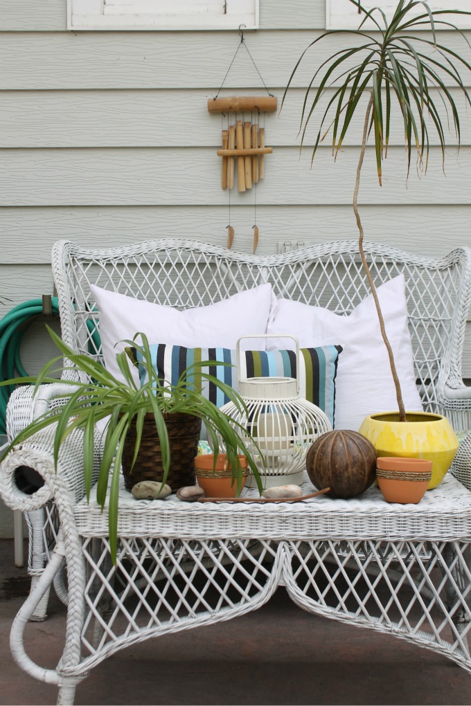 And then I’ve layered the wicker bench with a variety of plants, rocks and candles.