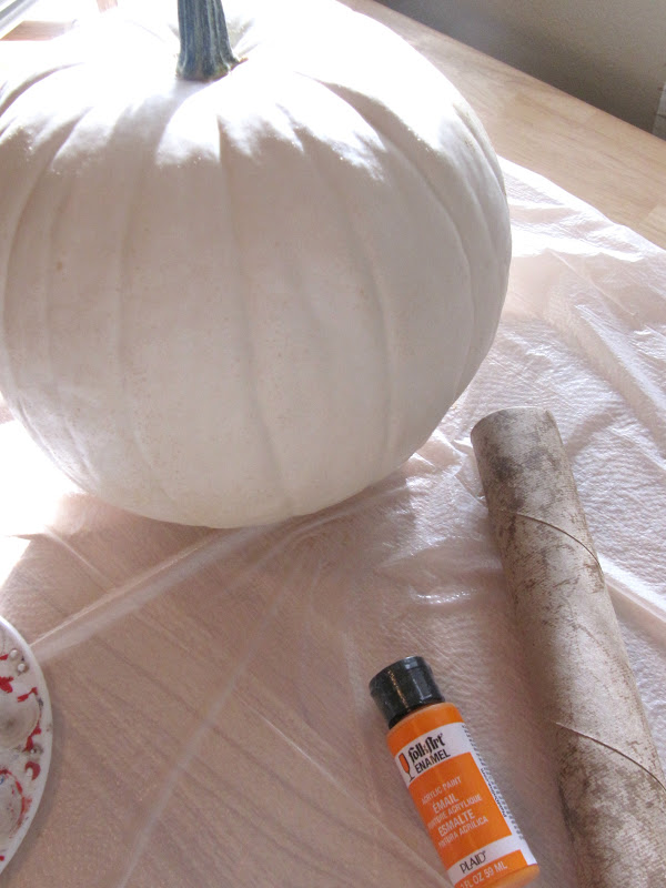 First I started off with one beautiful white pumpkin, an empty paper towel roll (you could use a toilet paper roll as well) and some orange craft paint.