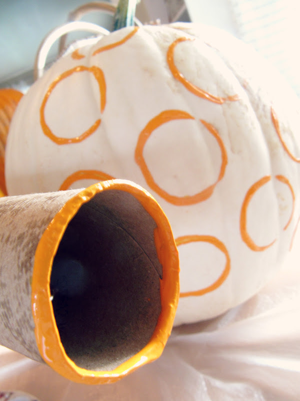 First I started off with one beautiful white pumpkin, an empty paper towel roll (you could use a toilet paper roll as well) and some orange craft paint.