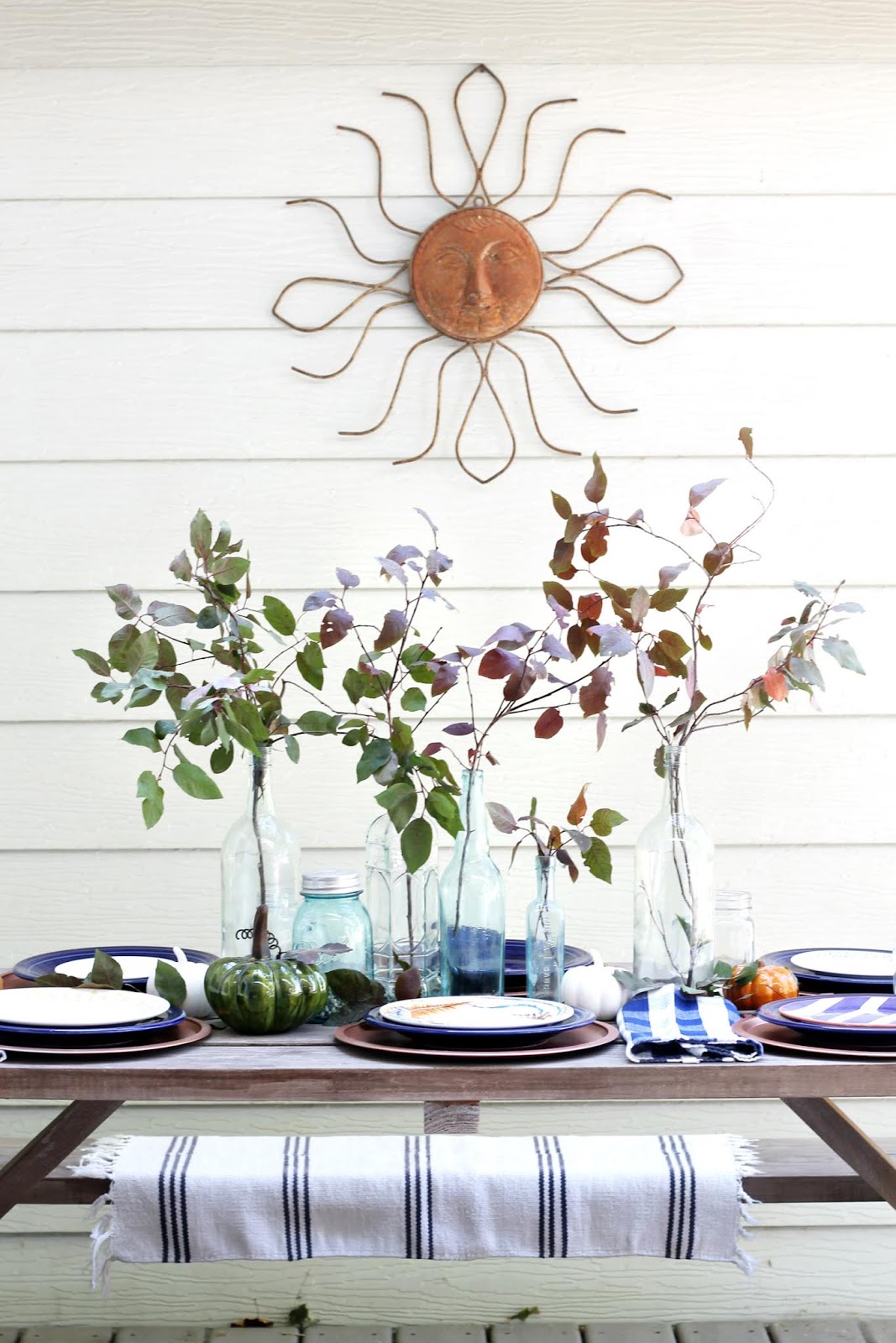 I arranged some bottles down the center of the table and then I placed a bunch of fresh clippings inside of them. I have a bush in my backyard that’s just barely starting to change colors and so I thought that some clippings from it would be perfect to use for my centerpiece.
