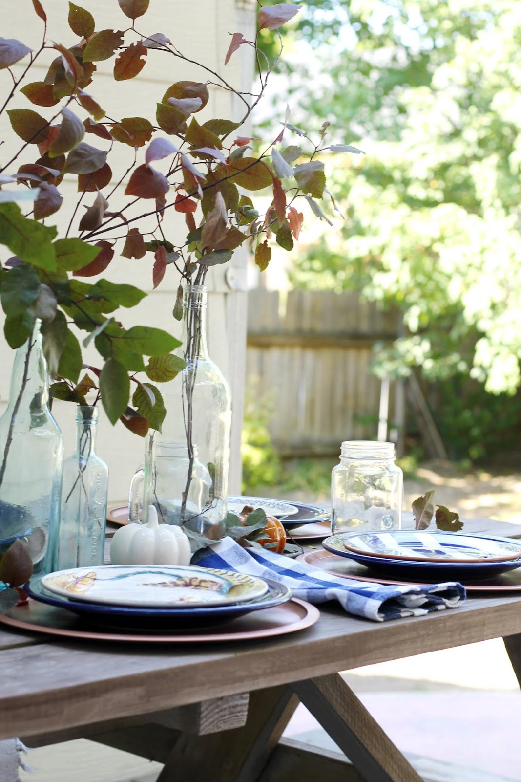 I arranged some bottles down the center of the table and then I placed a bunch of fresh clippings inside of them. I have a bush in my backyard that’s just barely starting to change colors and so I thought that some clippings from it would be perfect to use for my centerpiece.