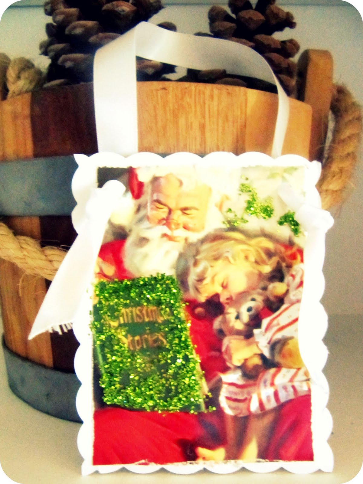 Just cut out the picture on a card, glue it to a piece of white card stock, punch holes at the top, then feed a ribbon through. On this one I also added glitter and trimmed it with scalloped scissors.
