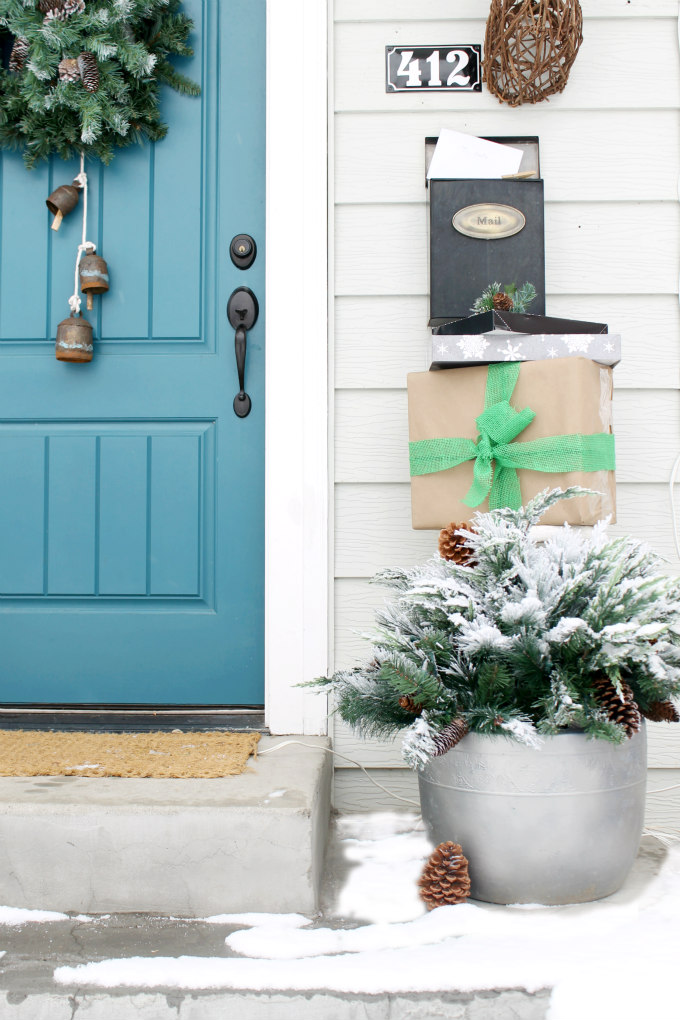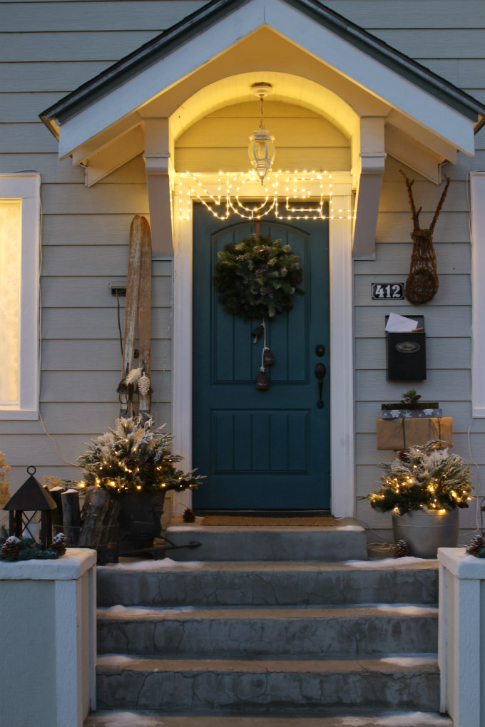 The wreath on the door is something I’ve created. I took a simple faux wreath and added a frosted faux swag to the center of it to give the wreath a fuller, more lux look. Then I added a strand of bells to hang from the wreath. The bells came from my uncle’s store, Backyard Birds in Salt Lake City, Utah. I’ve had the bells for years now and I can’t get over how pretty the blue patina on them is. It matches my door perfectly.