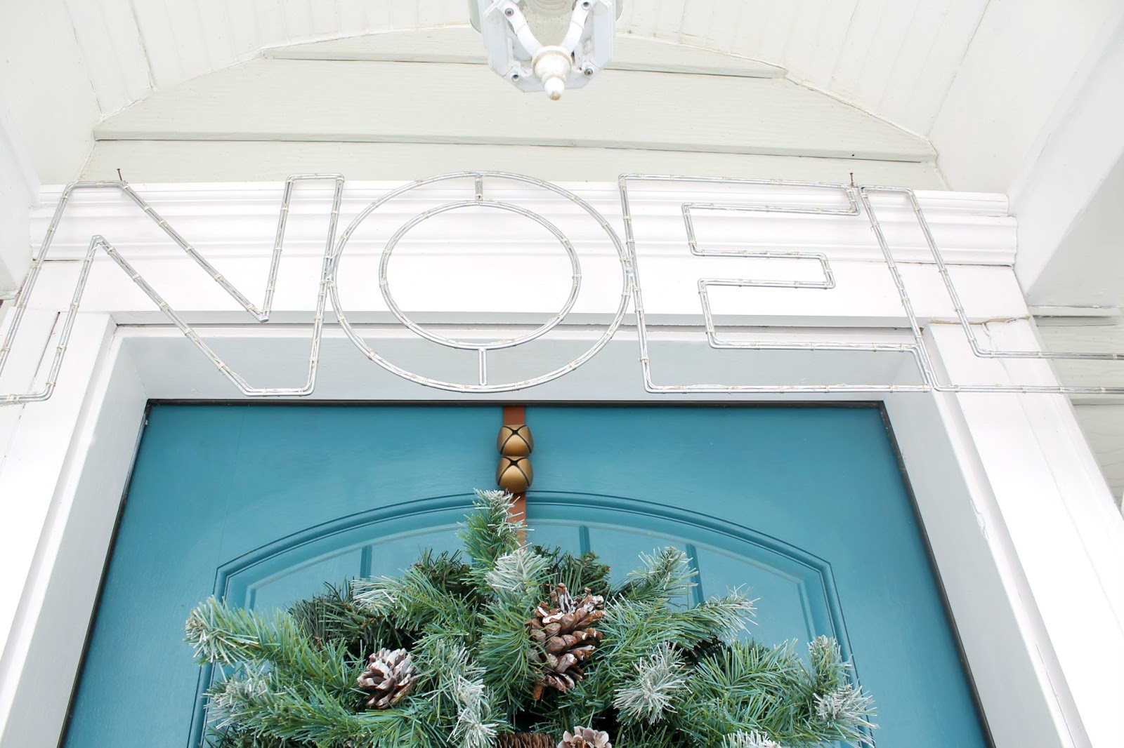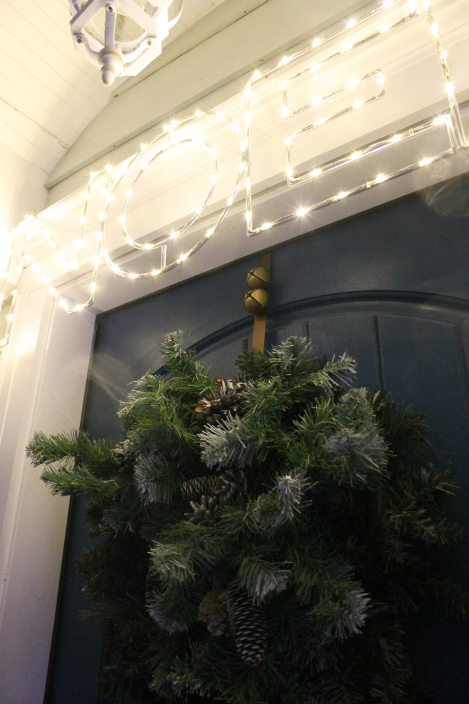 THISNoel sign could not have been a more perfect fit to go above our door. It has little white LED lights in it so it lights up and looks really festive at night.