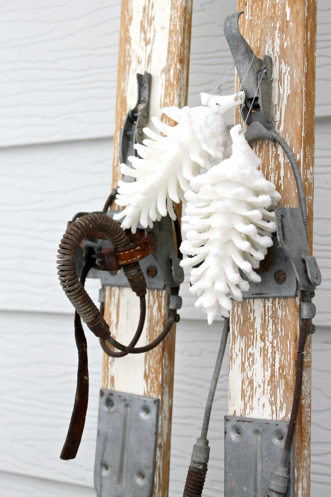 I adorned the skis with two pretty white pinecone ornaments.
