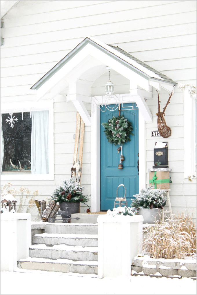 The wreath on the door is something I’ve created. I took a simple faux wreath and added a frosted faux swag to the center of it to give the wreath a fuller, more lux look. Then I added a strand of bells to hang from the wreath. The bells came from my uncle’s store, Backyard Birds in Salt Lake City, Utah. I’ve had the bells for years now and I can’t get over how pretty the blue patina on them is. It matches my door perfectly.