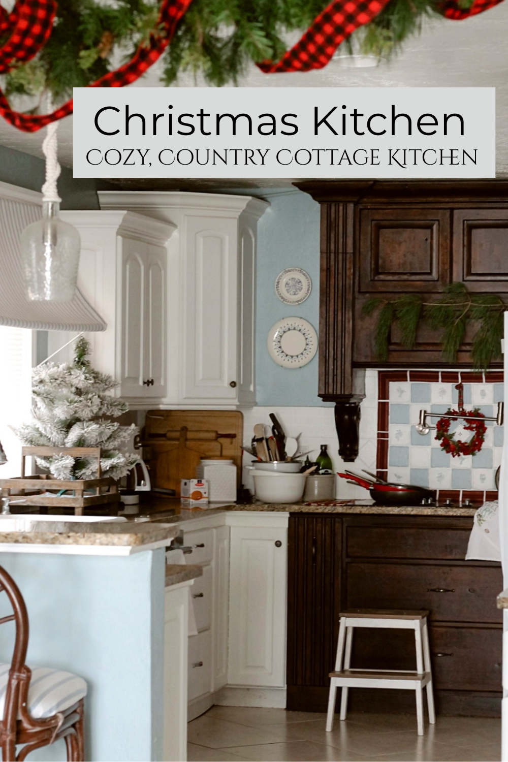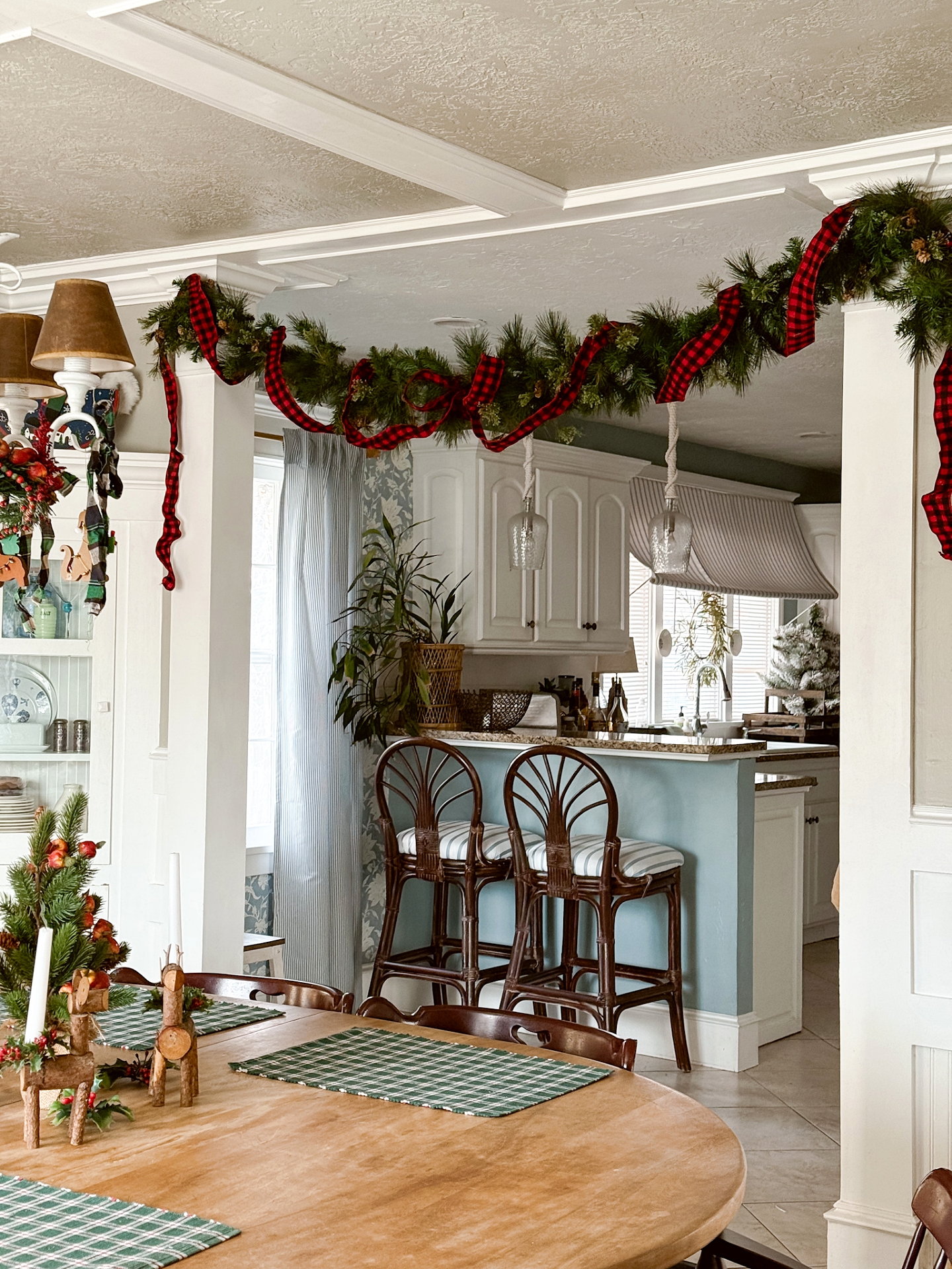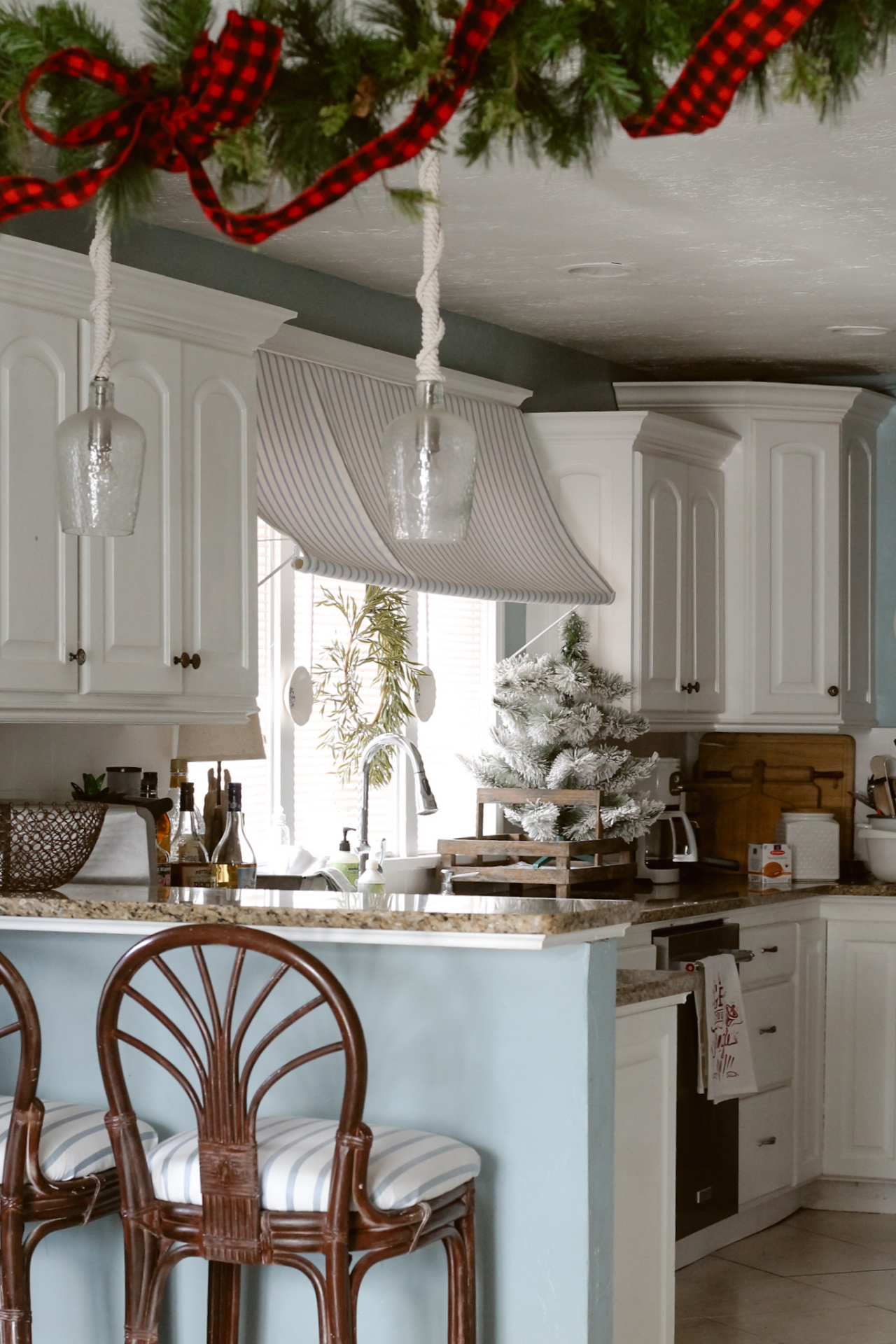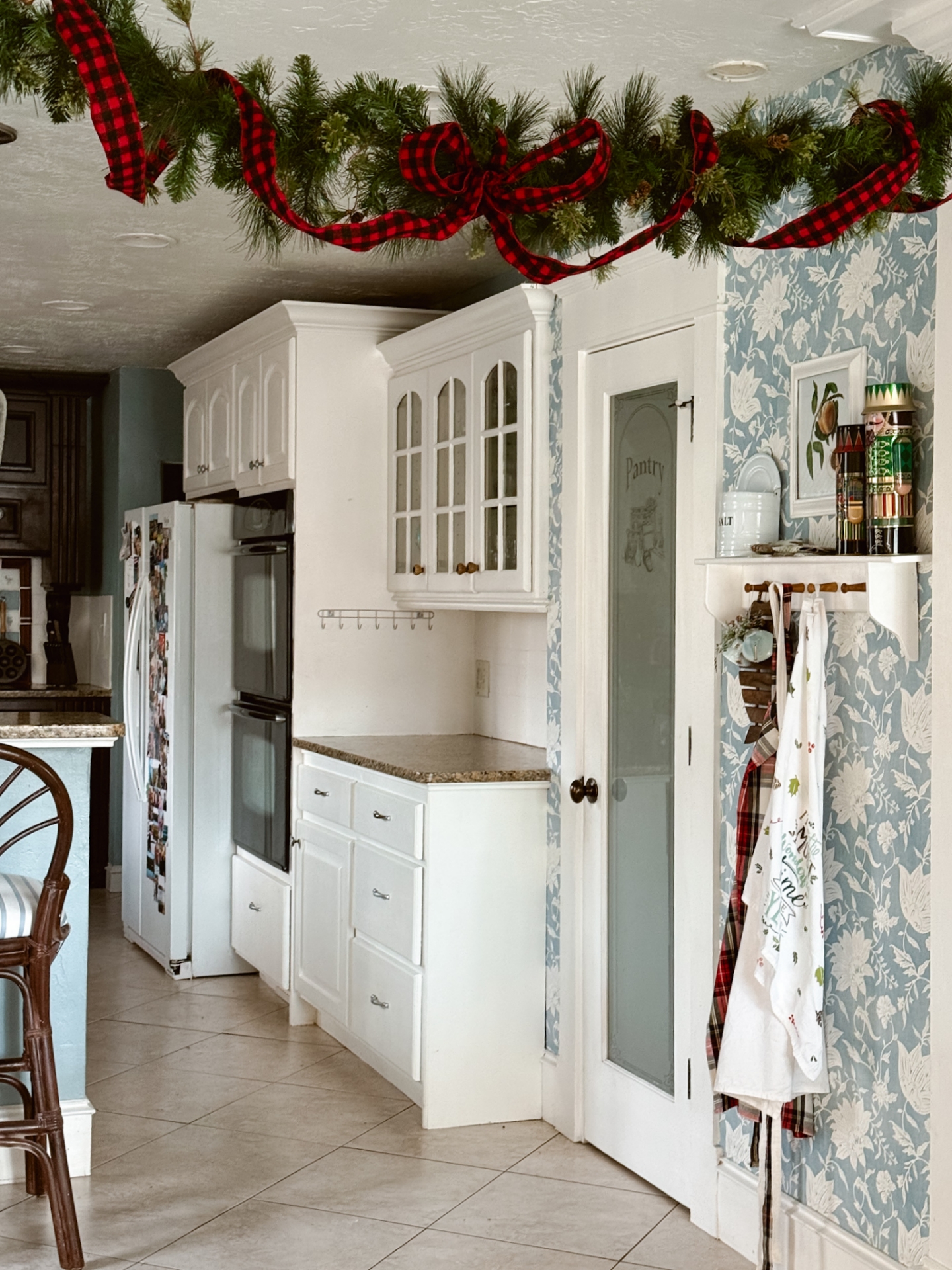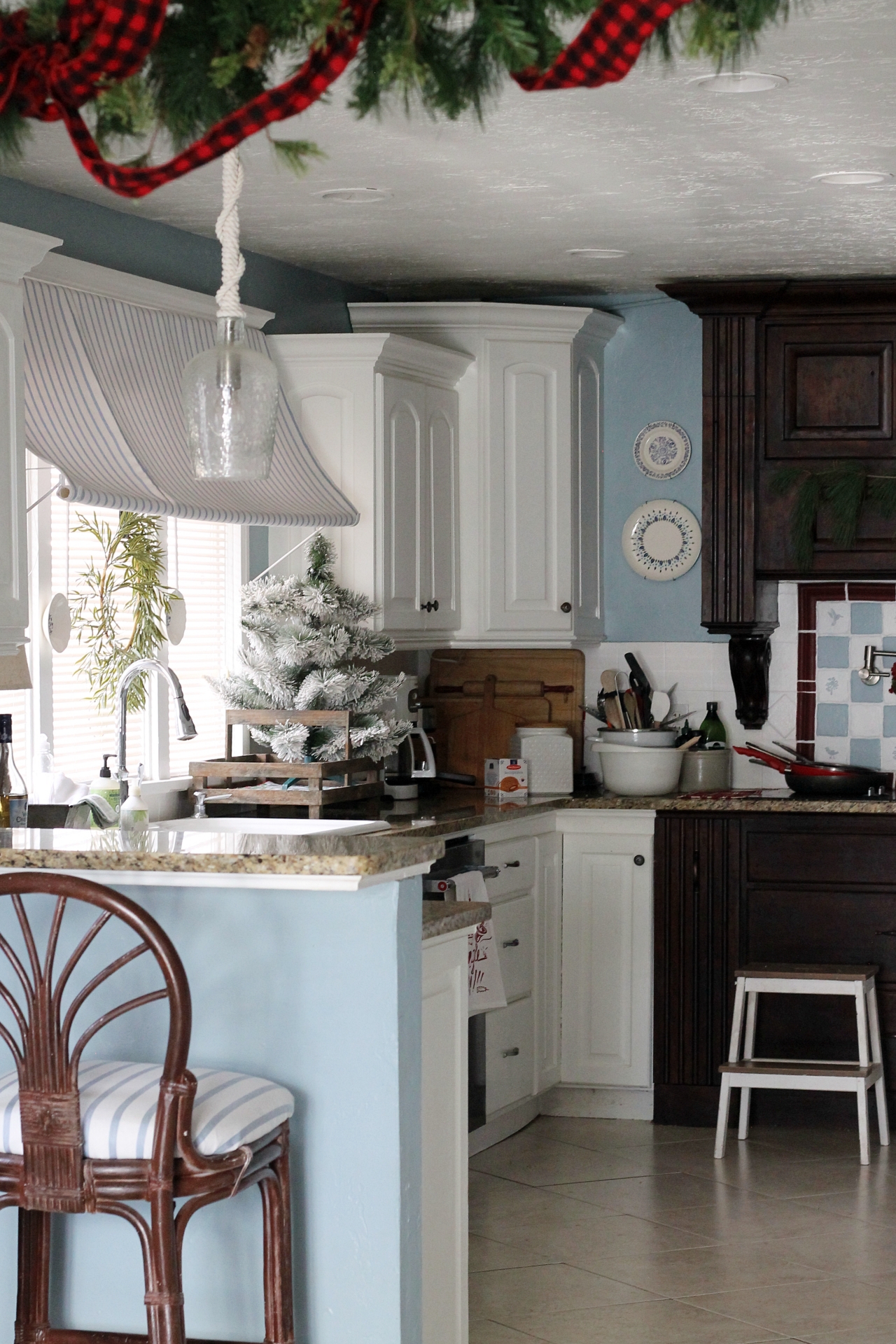 As far as decorating the room for Christmas, I really kept it simple -like I usually do. I hung a real pine branch and a small red berry wreath at my stove area and then brought in a flocked mini tree and placed it next to my sink. There is also a garland hanging up above the walkway from the dining room into the kitchen.