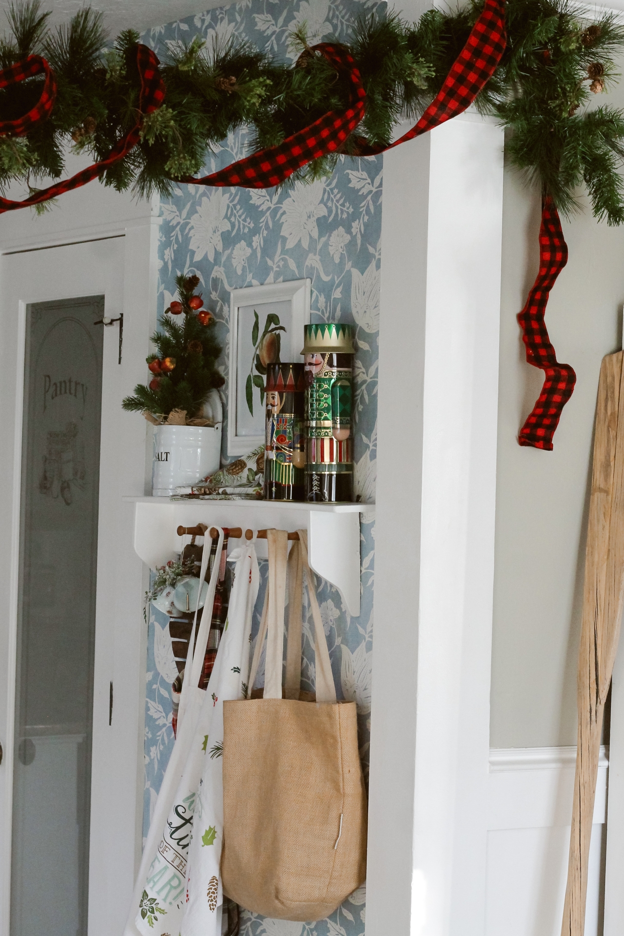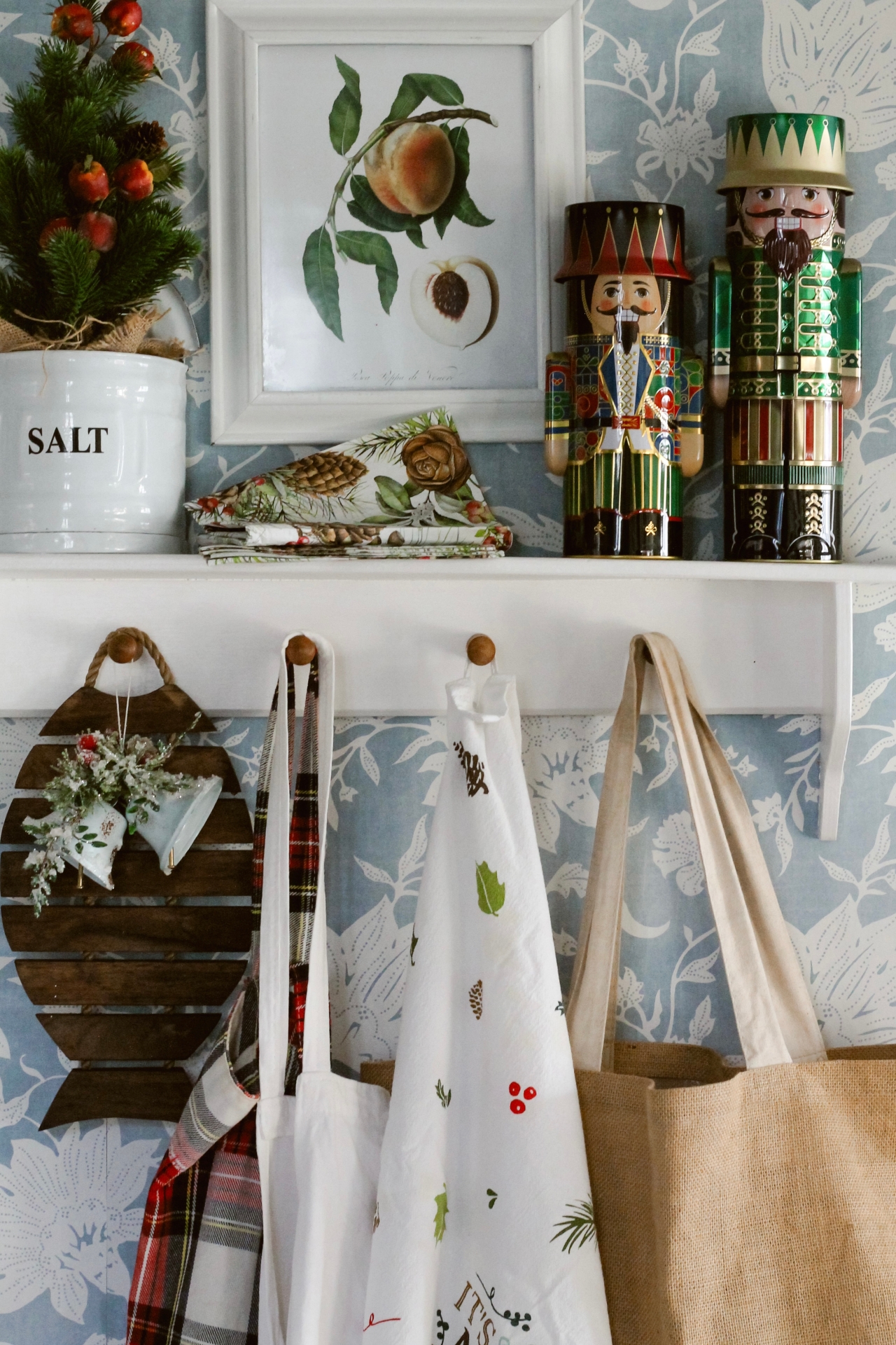 I do have fun decorating this little shelf though. A few nutcracker tins, and some holiday linens gives this wall a cheerful look for Christmas.