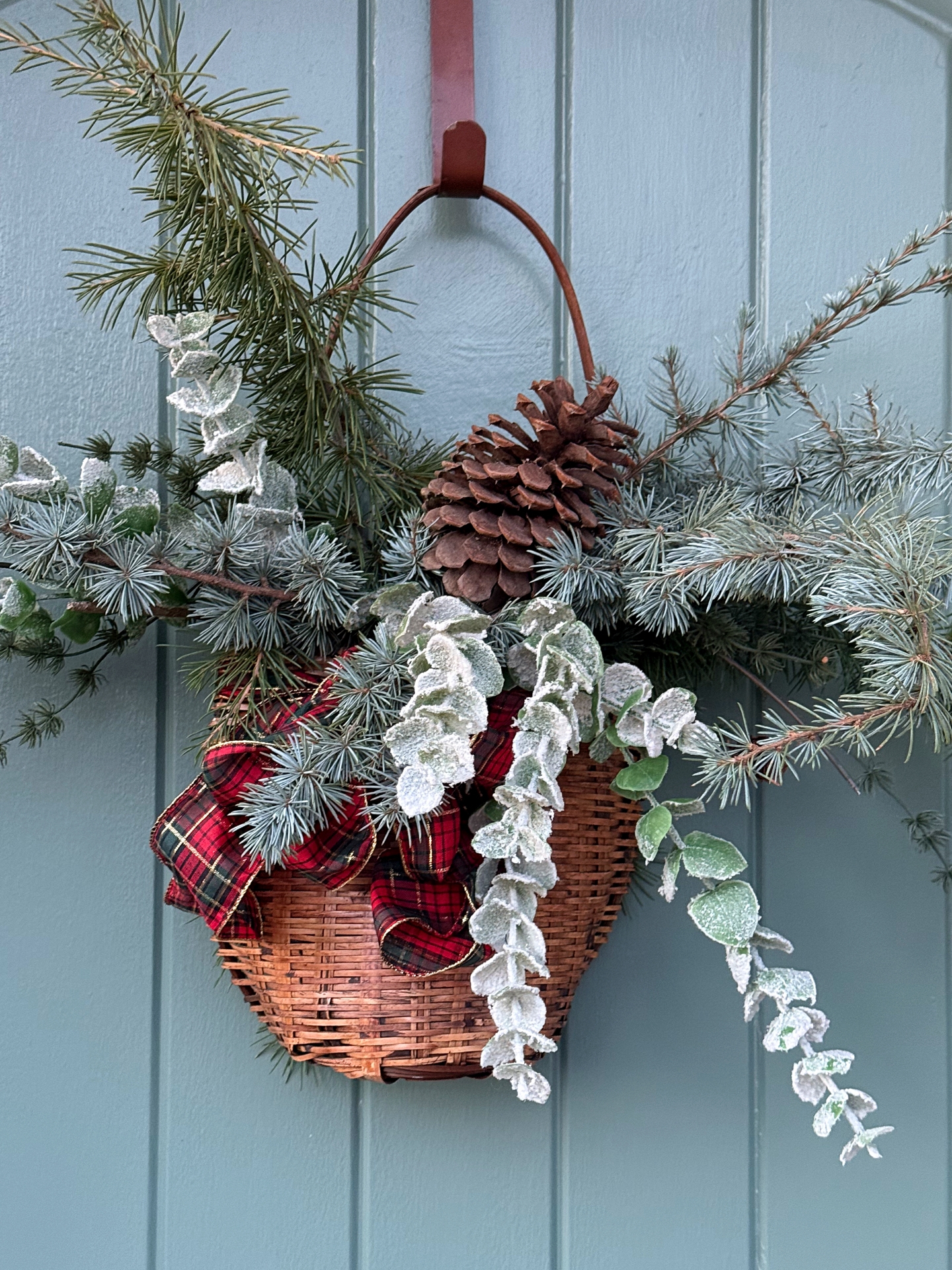 For my Christmas Wreath this year, or I should say, instead of having a wreath this year, I filled a hanging basket full of green branches- both a mix of real and faux. The basket came from a FREE shelf outside of my local thrift store. As soon as I saw it, I knew I would be hanging on my door for Christmas – full of branches and with a big plaid bow. It turned out exactly how I had imagined it to look.
