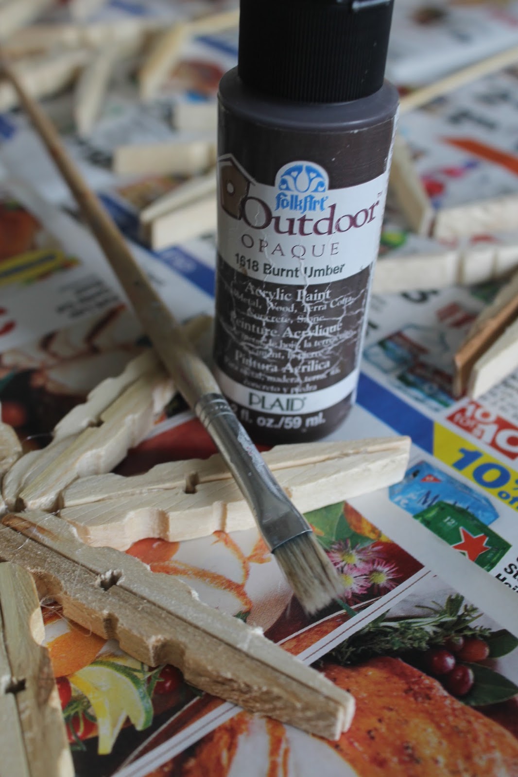 I could have left them the raw wood, but I decided I wanted them a darker brown. I could have stained them, but I didn’t have the color I wanted. I also could have spray painted them, but again, I didn’t have the color I wanted. So I choose to paint them by hand using a craft paint. Although I did have to add a little water to it, to make it easier to reach inside all of the crevasses.