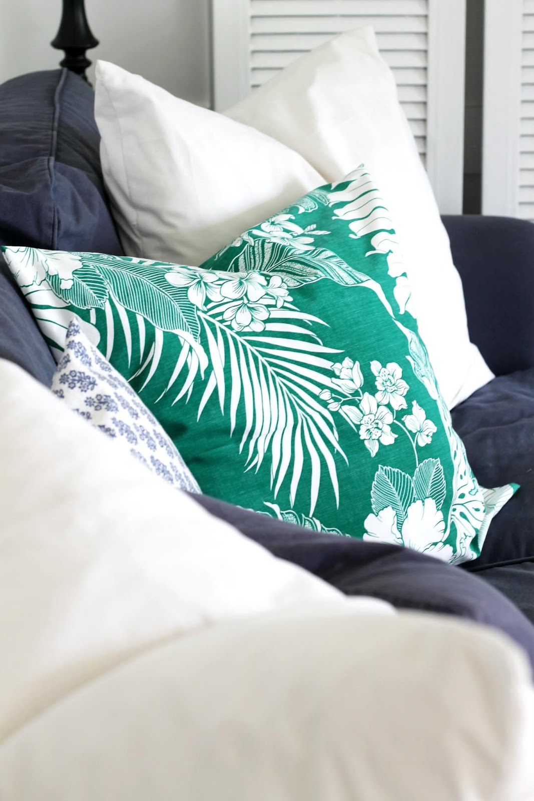 The green pillow on the couch is also in that happy green color as the mirror.  You may know this already, but I purchased the fabric to make the pillow on arecent trip to Hawaii.  Out of the hundreds of pillows around our home, this one is my very favorite 🙂