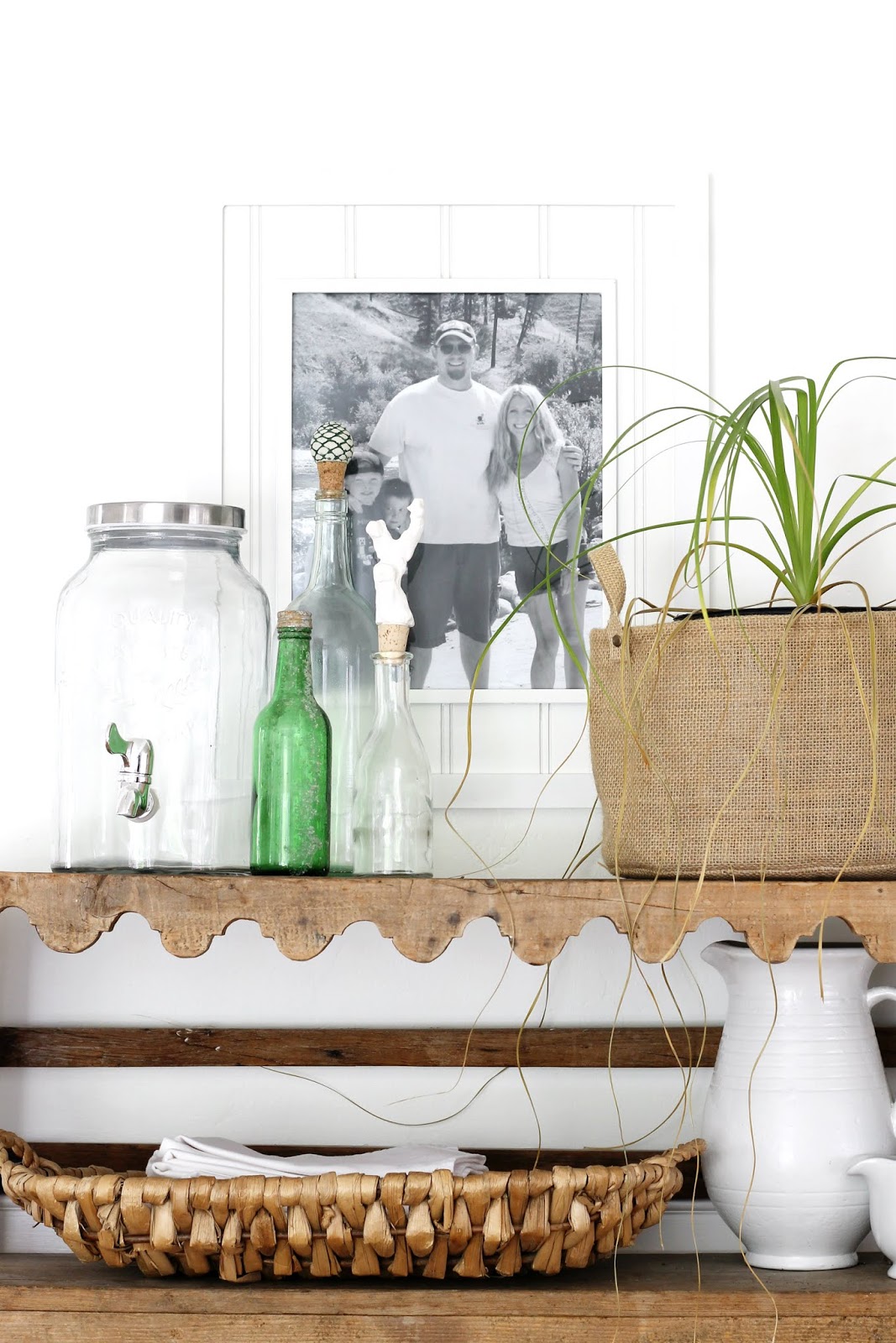 I like to bring in some of the ornamental grasses that are growing in our front yard.  I feel like the grass adds a relaxed beach feel to our home. Also, by soaking the grass’s roots in water it allows me to plant it in other areas of our yard later on.