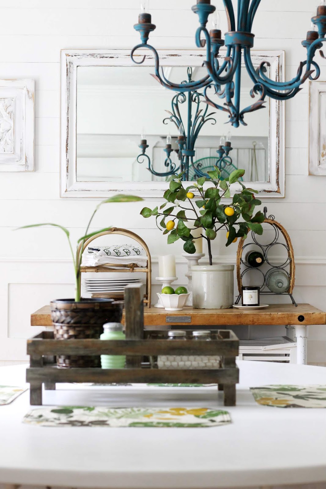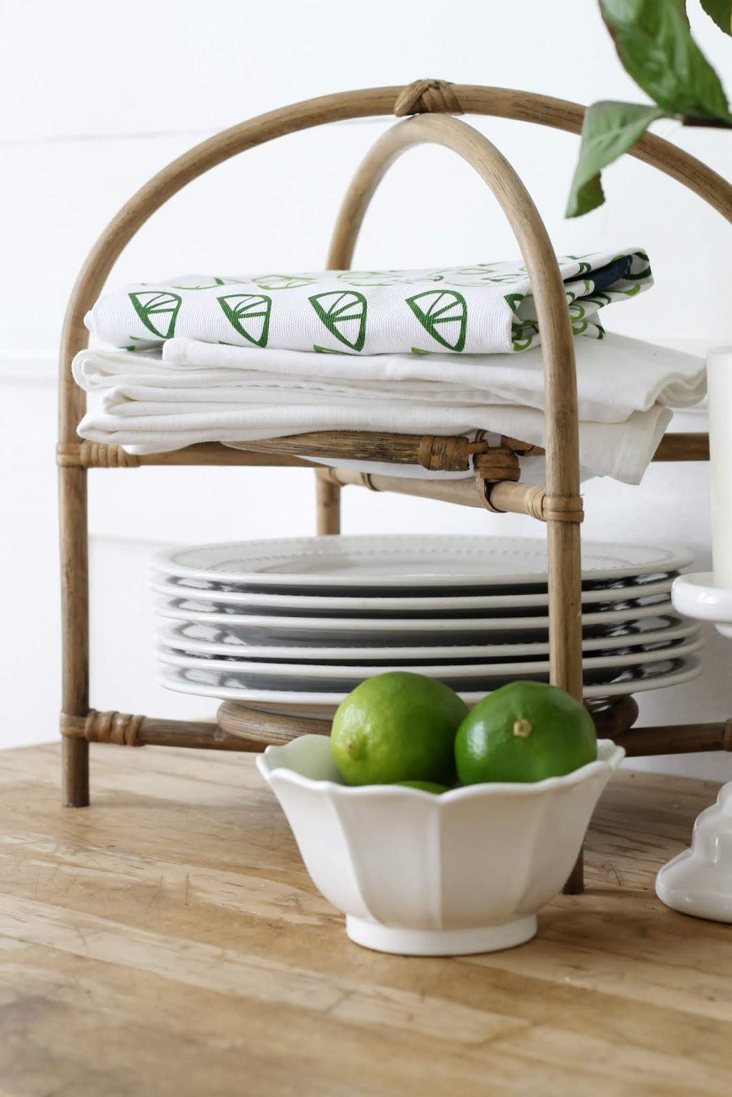 As for the dining room, I’ve set out some fun tropical place mats that I’ve had for ages, and then I snooped around the kitchen for more green items.