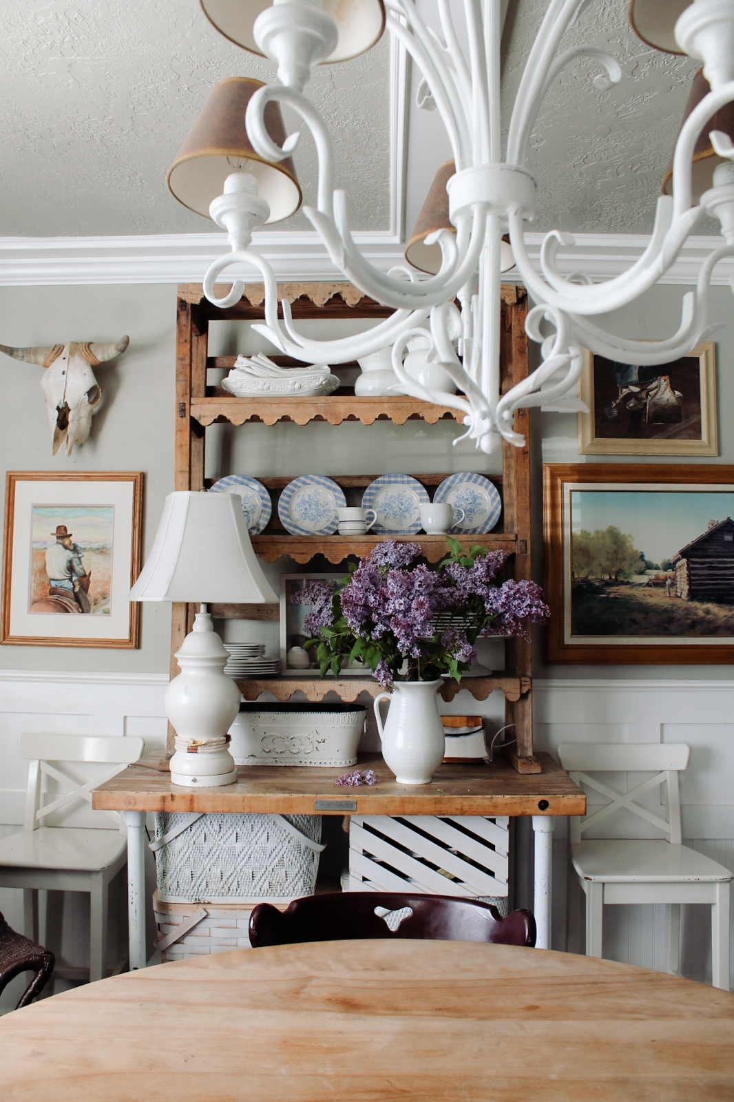 You know, I just realized that I haven’t blogged about our dining room in a while, and so you might not have seen the artwork hanging in here yet. The two cowboy pictures were painted by my husband’s grandpa. My husband is the little boy riding on the horse with his grandpa, so cute! And then the barn picture was painted by someone else and my husband was the boy in that picture too. So they have some fun stories behind them. The cow skull was bought at an antique store years ago.
