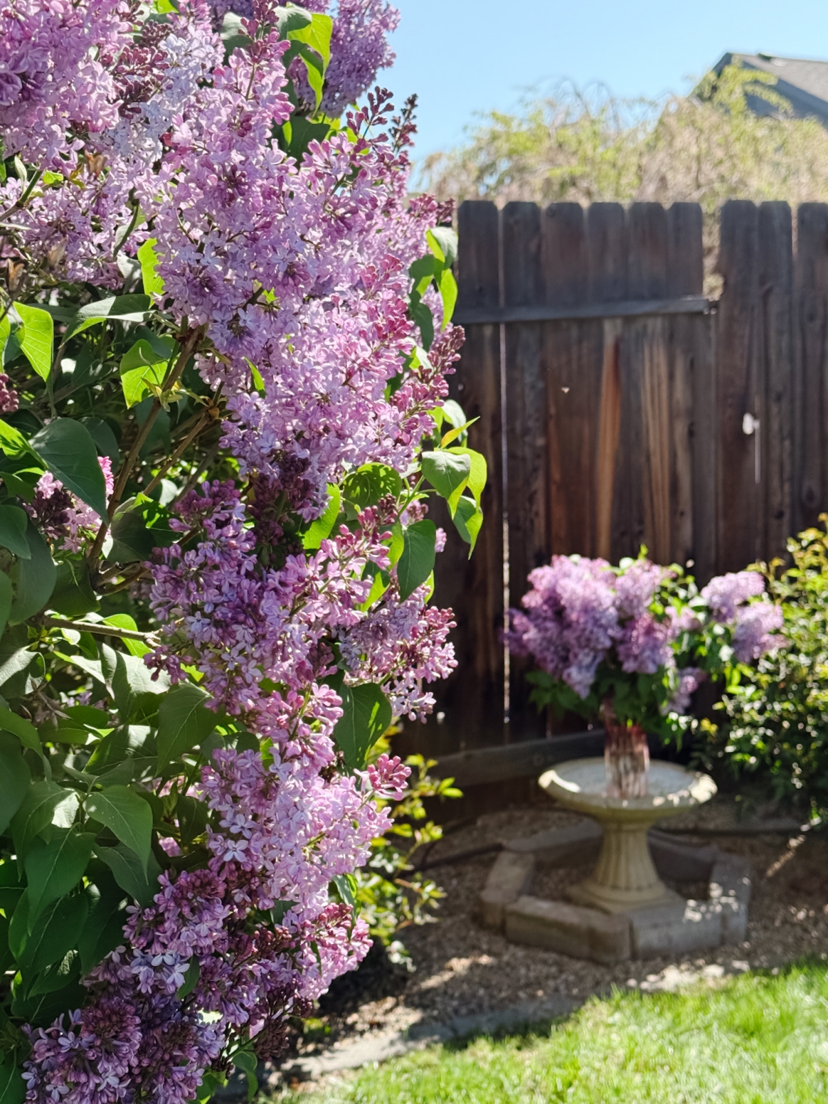 Lilacs make the prettiest bouquets too! We had a vase sitting on her bird bath as we cut the branches, and I thought that this scene was so beautiful so I had to snap a picture.