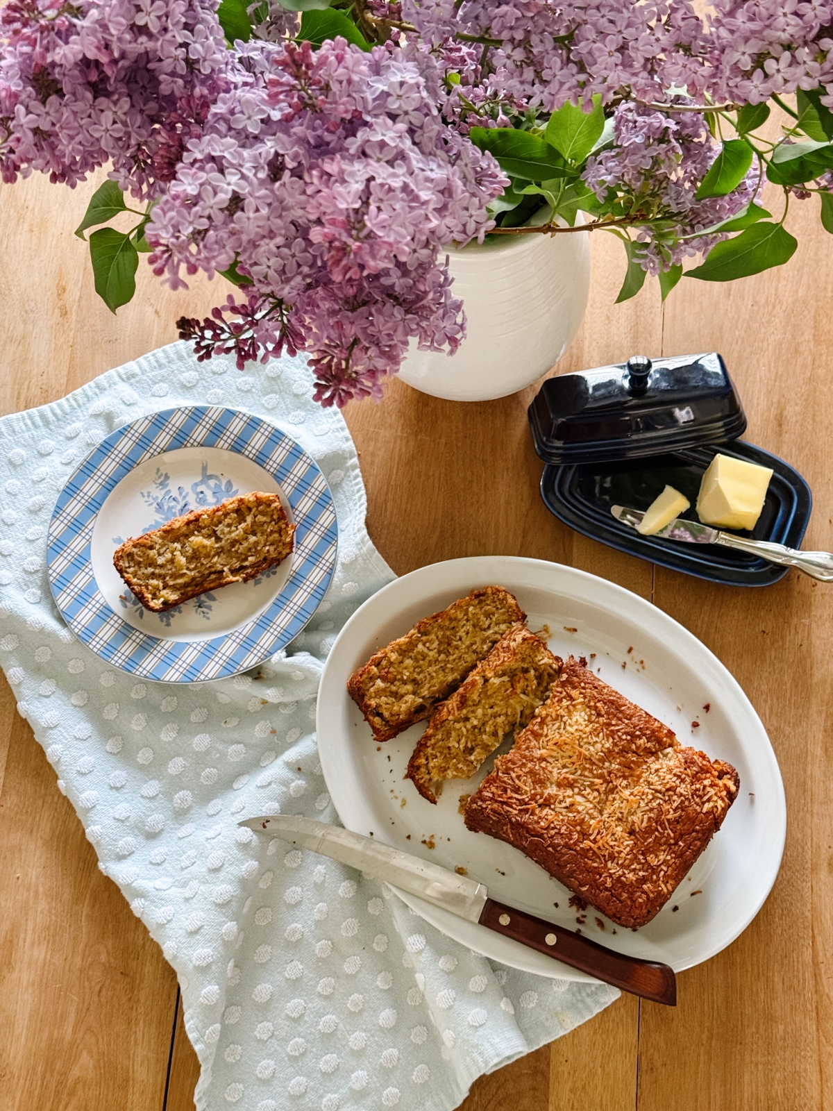 I just shared a blog post about my Toasted Coconut Banana Bread Recipe, and my Lilacs were featured in that post as well. When I shared it on Instagram, I made the comment, that I didn’t know which smelled better; the pitcher full of lilacs or the freshly baked banana bread. Both smelled amazing!