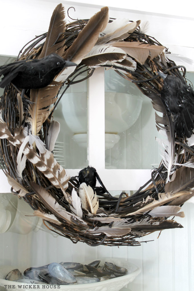 I then adorned the wreath with the feathers.  I didn’t even use glue, I just stick the feathers in the wreath, and they seem to be staying in place just fine.