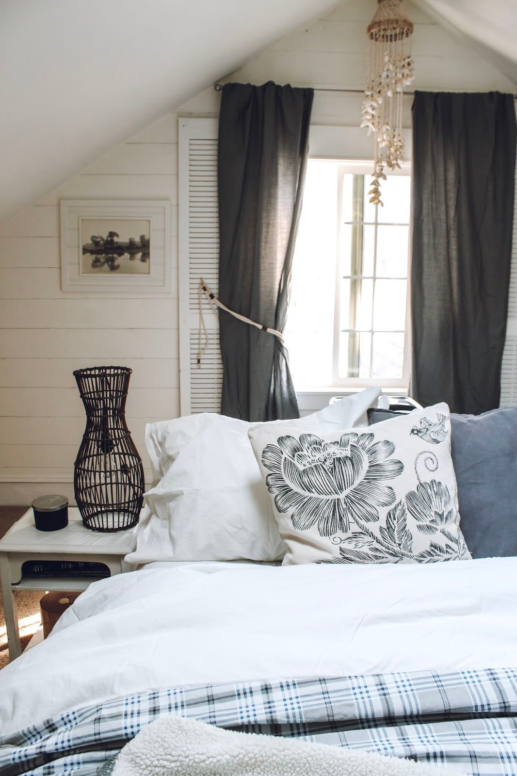 First of all I switched out my white curtains for some dark grey ones. These aren’t even curtains, I’ve just cut a twin size bed sheet in half and called it good. Just changing the color of the curtains made such a huge change to our room.