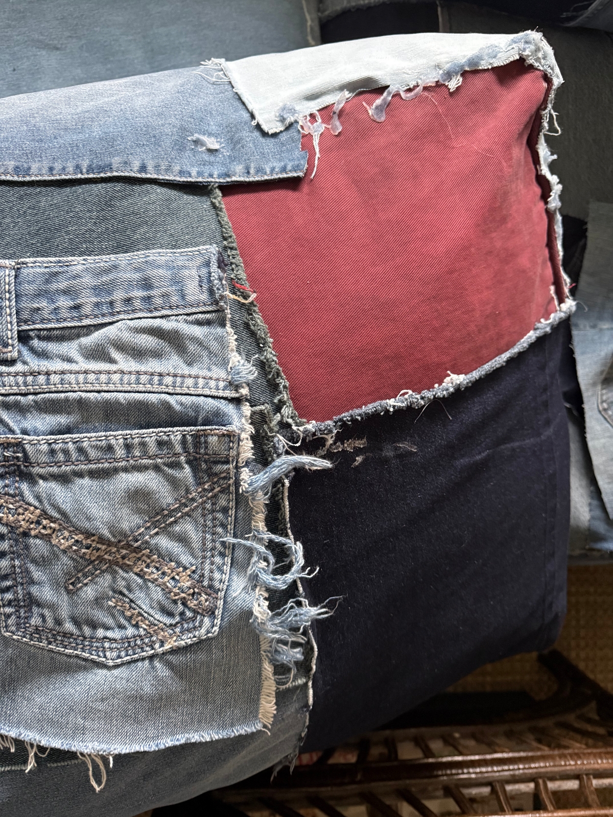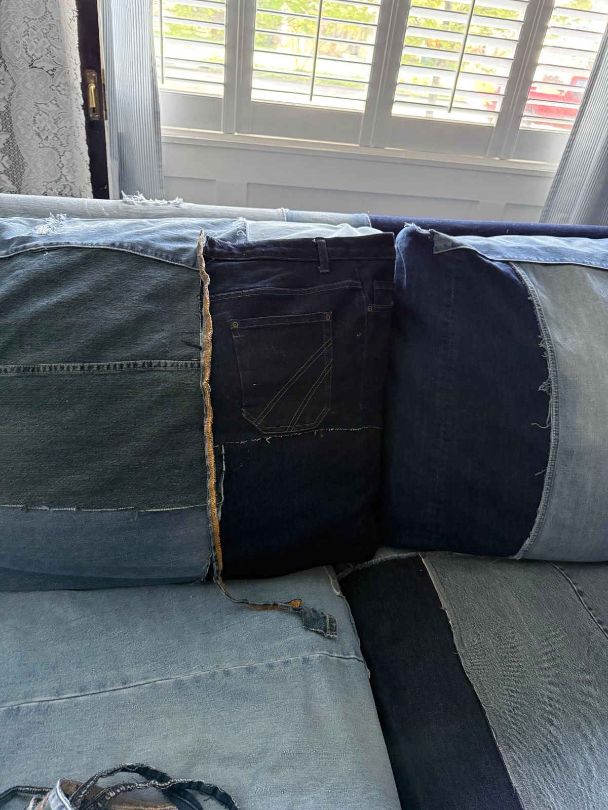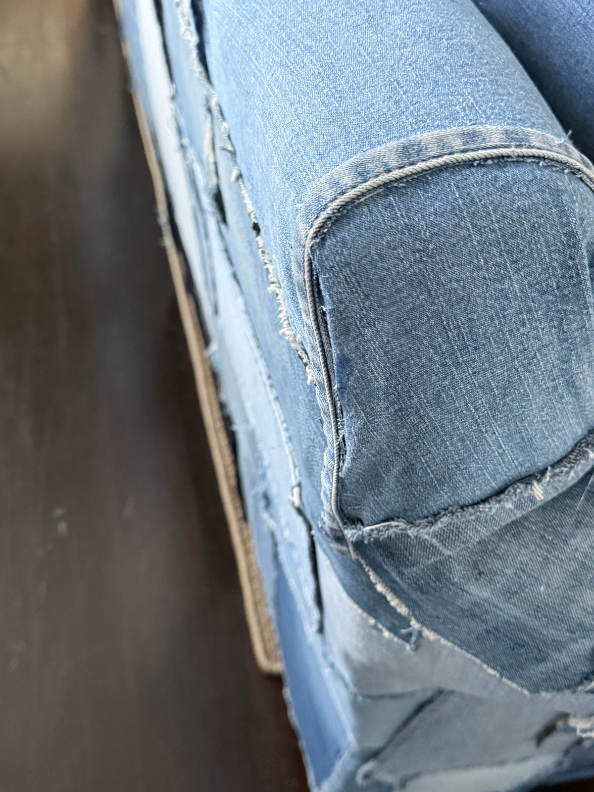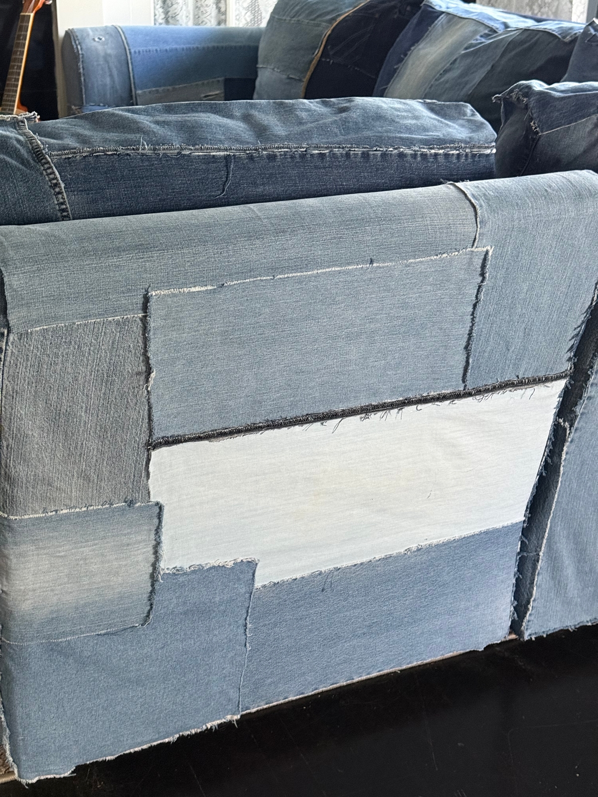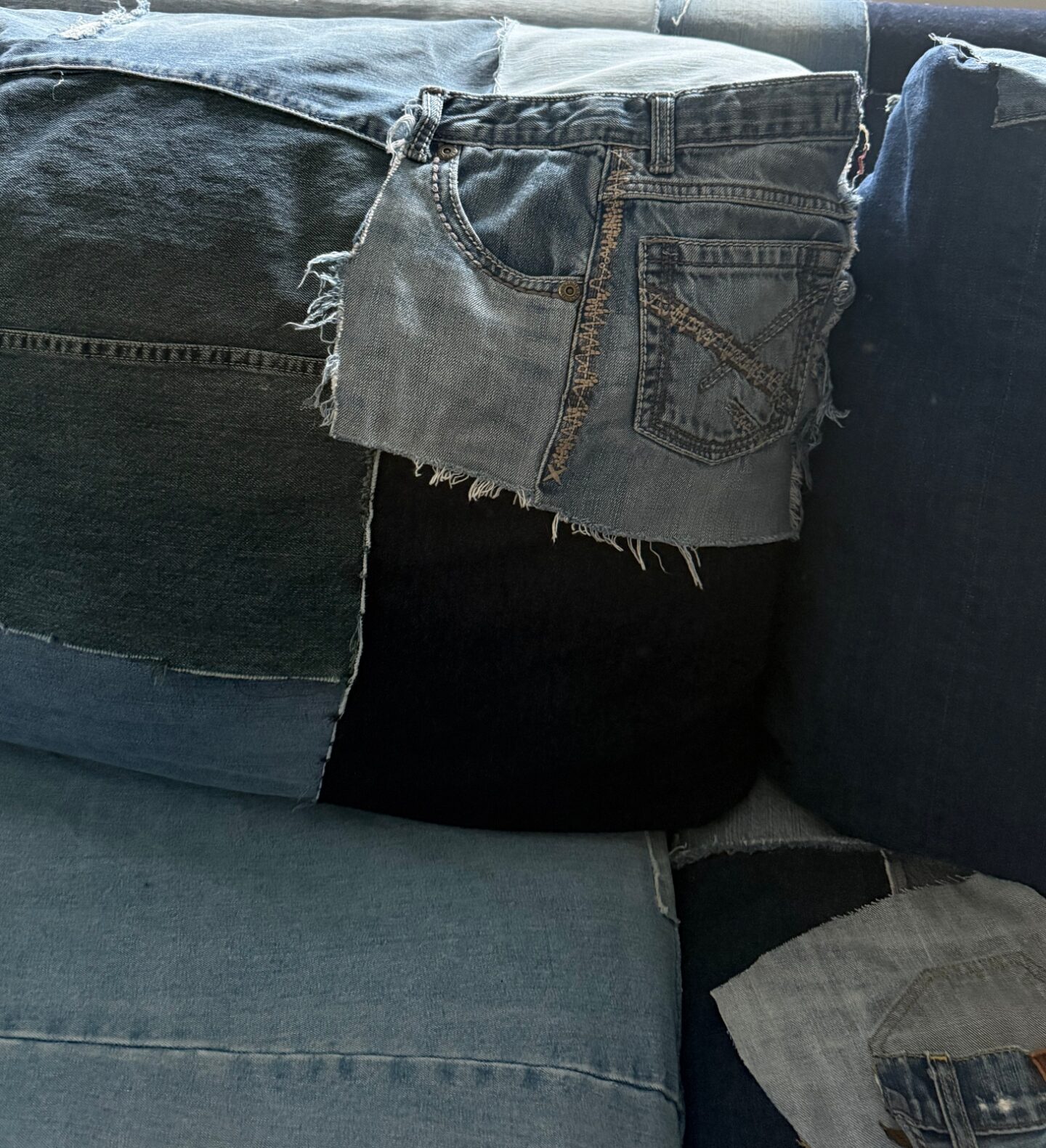 The piece of denim I replaced it with was a darker wash and actually came from the same pair of jeans that sits just underneath the new patch. Because of that, it now looks like one intentional darker section rather than a random light-wash pocket standing out on its own. The new piece blends in much better and feels more cohesive with the rest of the couch.
