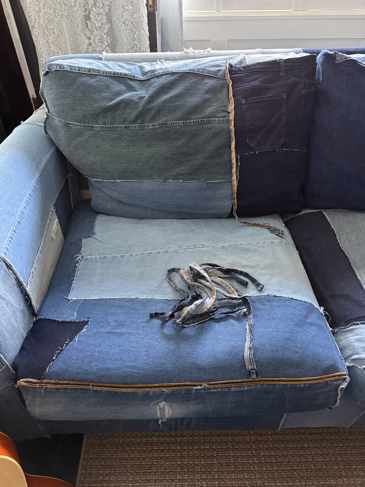 I added five of these seams in different areas of the couch. The seams added a clean finishing touch. Below is one strip that is darker in color and it helped it add a little bit of darker denim to this lighter denim section.
