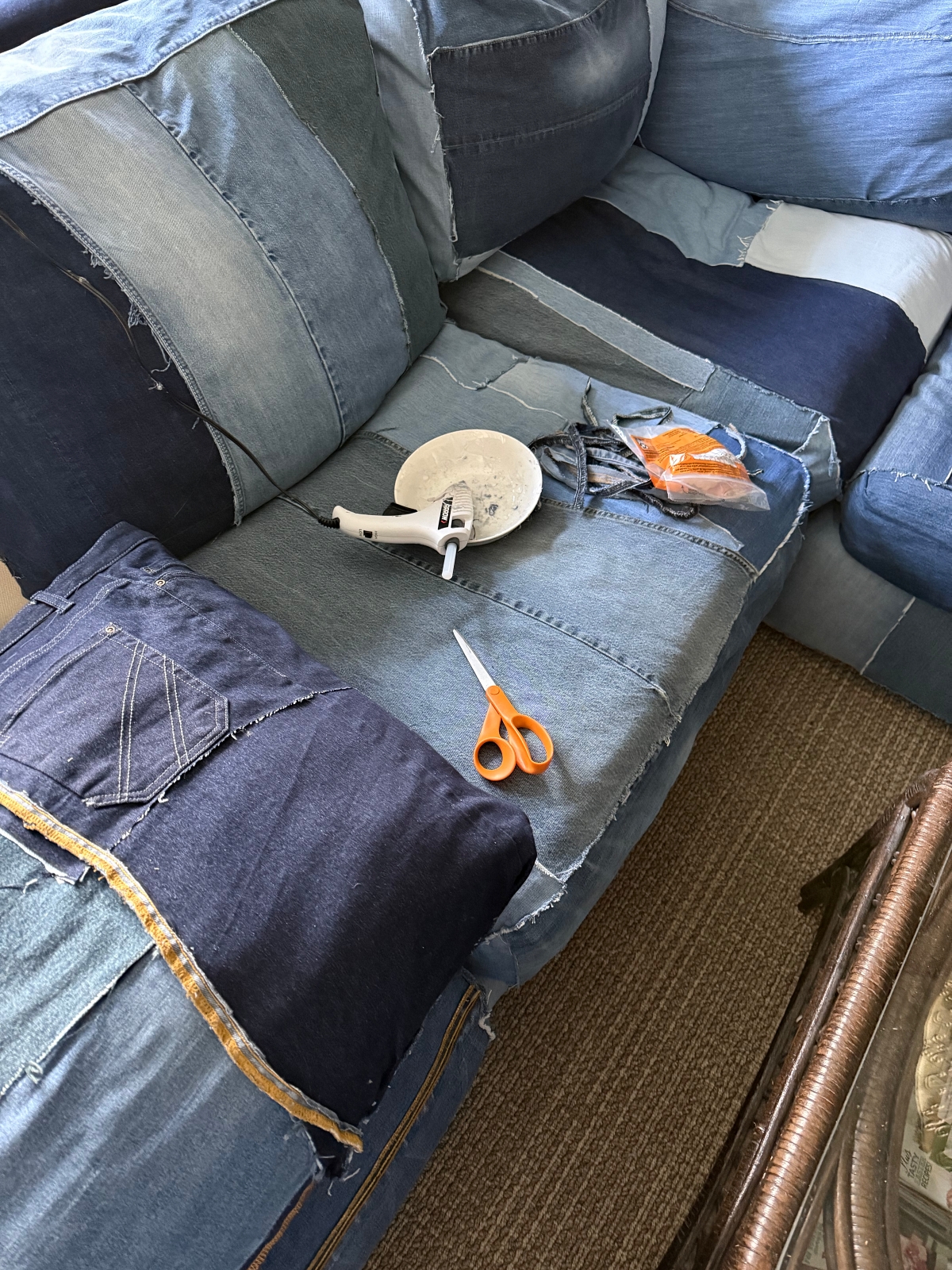 I still can’t believe I pulled this couch off with only using Hot Glue! It’s a little unbelievable! Had I known this couch would be so easy to just hot glue denim pieces on to it, I would have done this years ago.