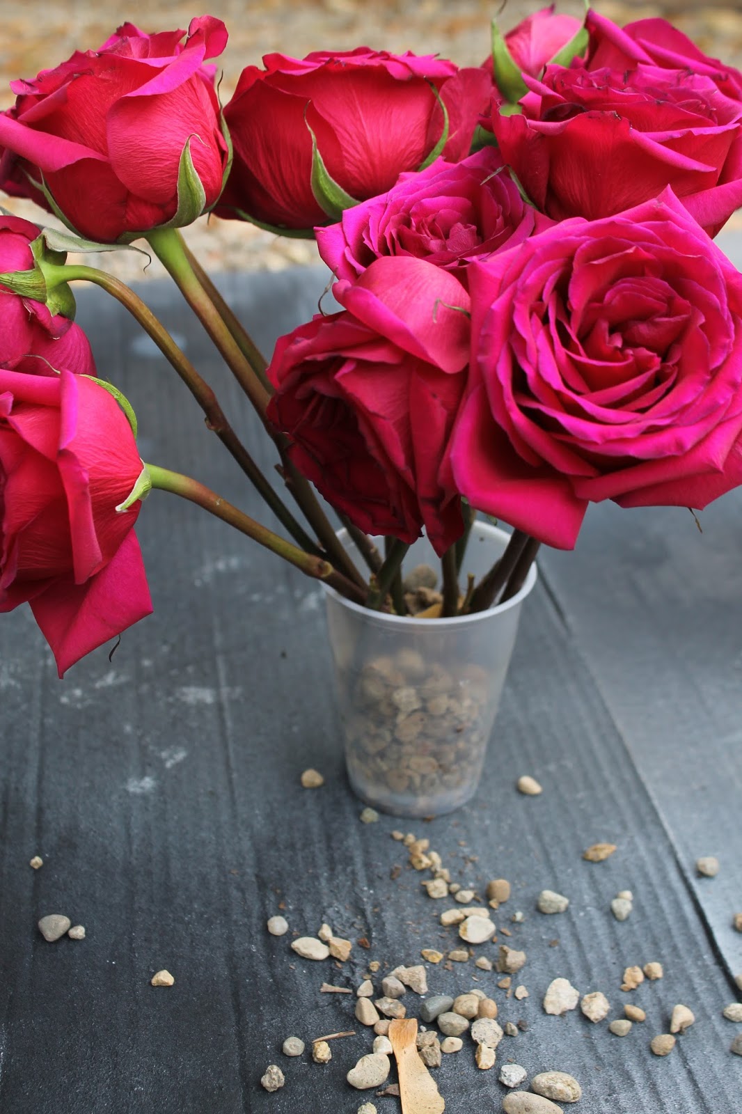 As you can see, I just stuck the roses in a plastic cup with some gravel.