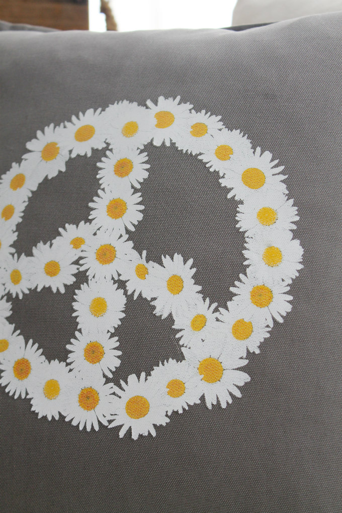 The second pillow, possible my favorite, is this adorable daisy peace sign pillow. This one was made using a commercial grade heat transfer vinyl and it is also on a gray canvas cotton pillow cover.