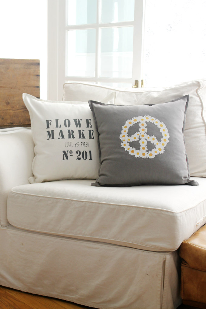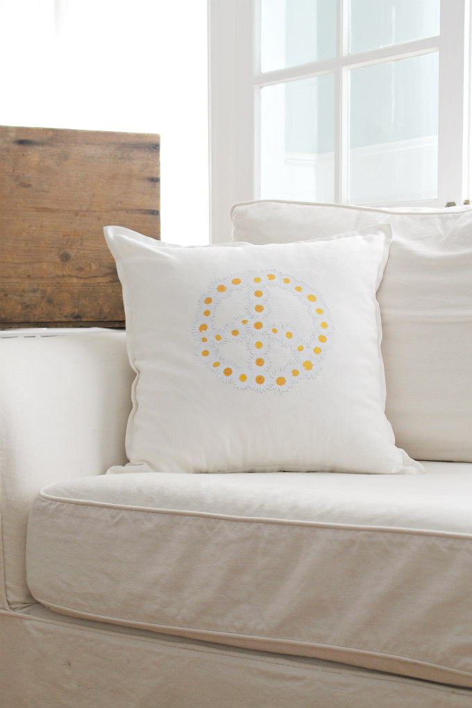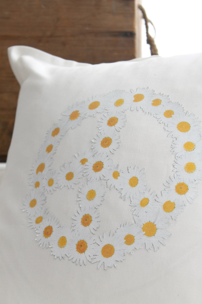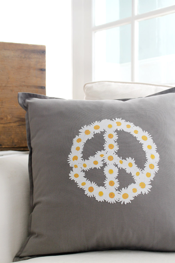 The second pillow, possible my favorite, is this adorable daisy peace sign pillow. This one was made using a commercial grade heat transfer vinyl and it is also on a gray canvas cotton pillow cover.