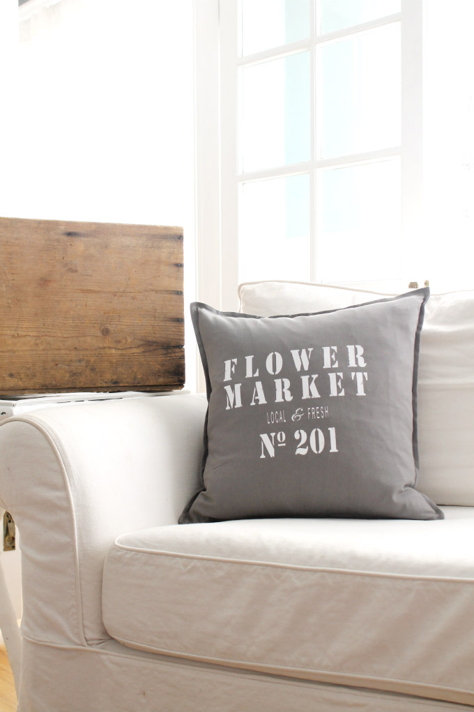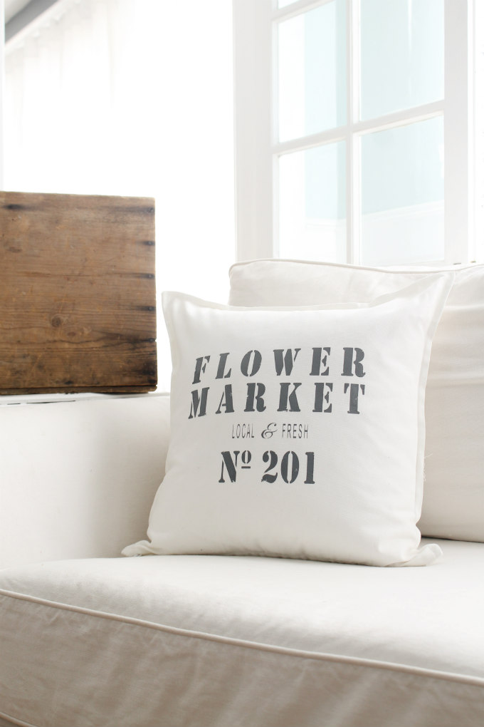 The first pillow, which happens to be my sisters favorite, is this ‘Flower Market’ pillow. The letters are in a distressed dark gray and printed on a white cotton canvas pillow cover.