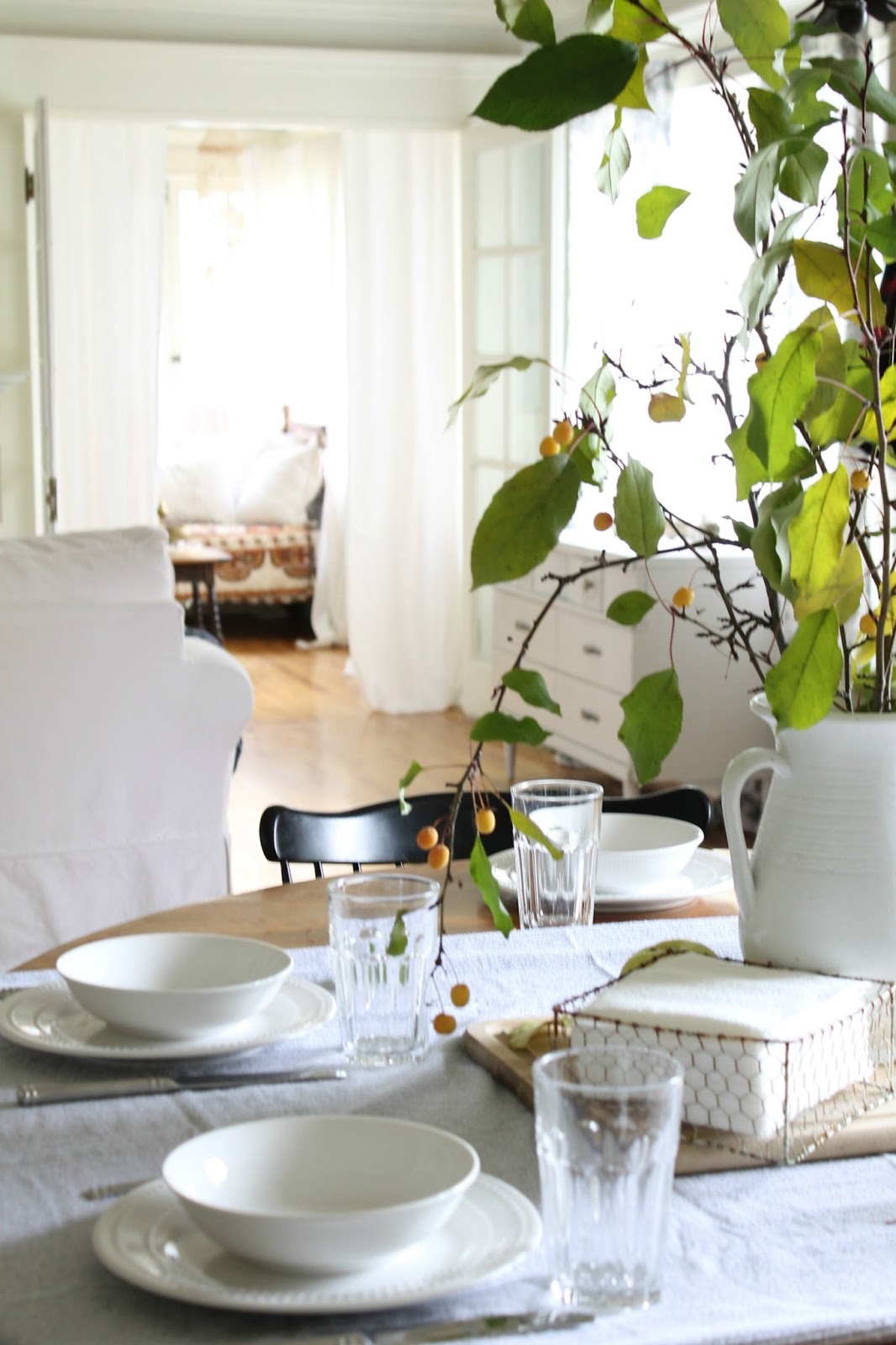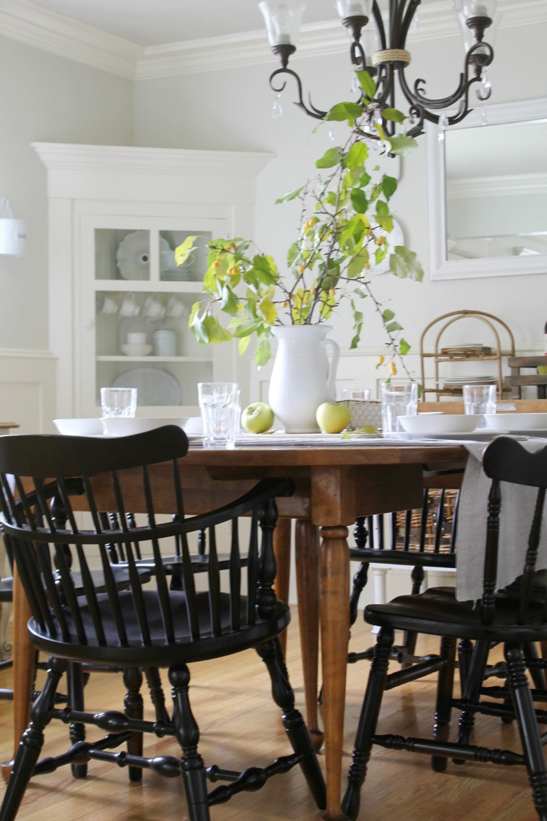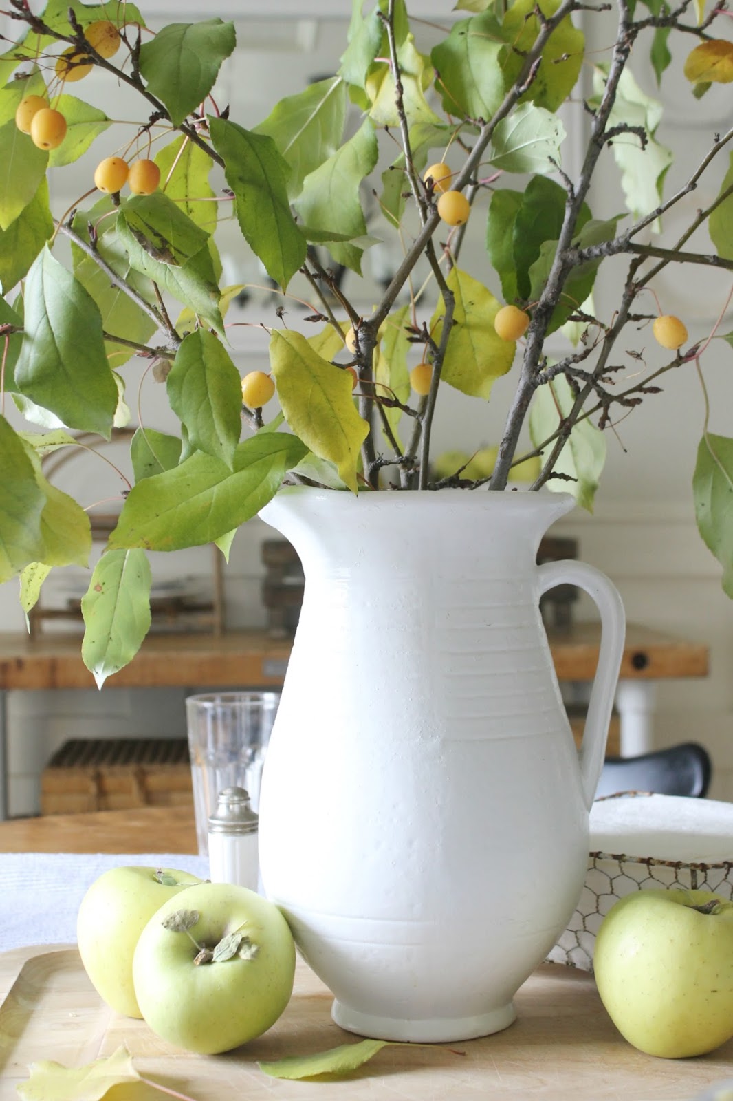 I then brought in some pretty branches from outside, placed them in a white pitcher and scattered a few honey crisp apples around. Simple and pretty.