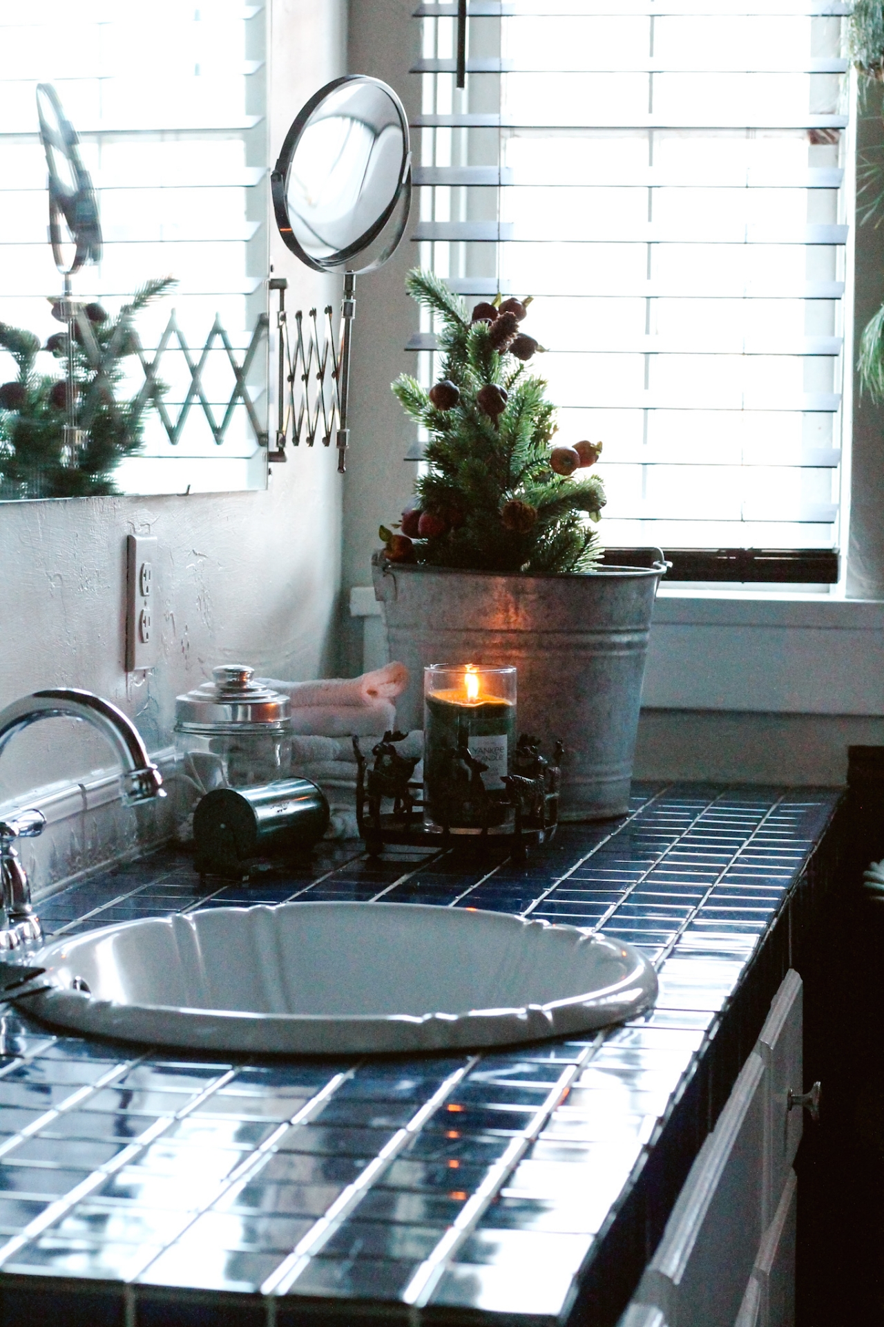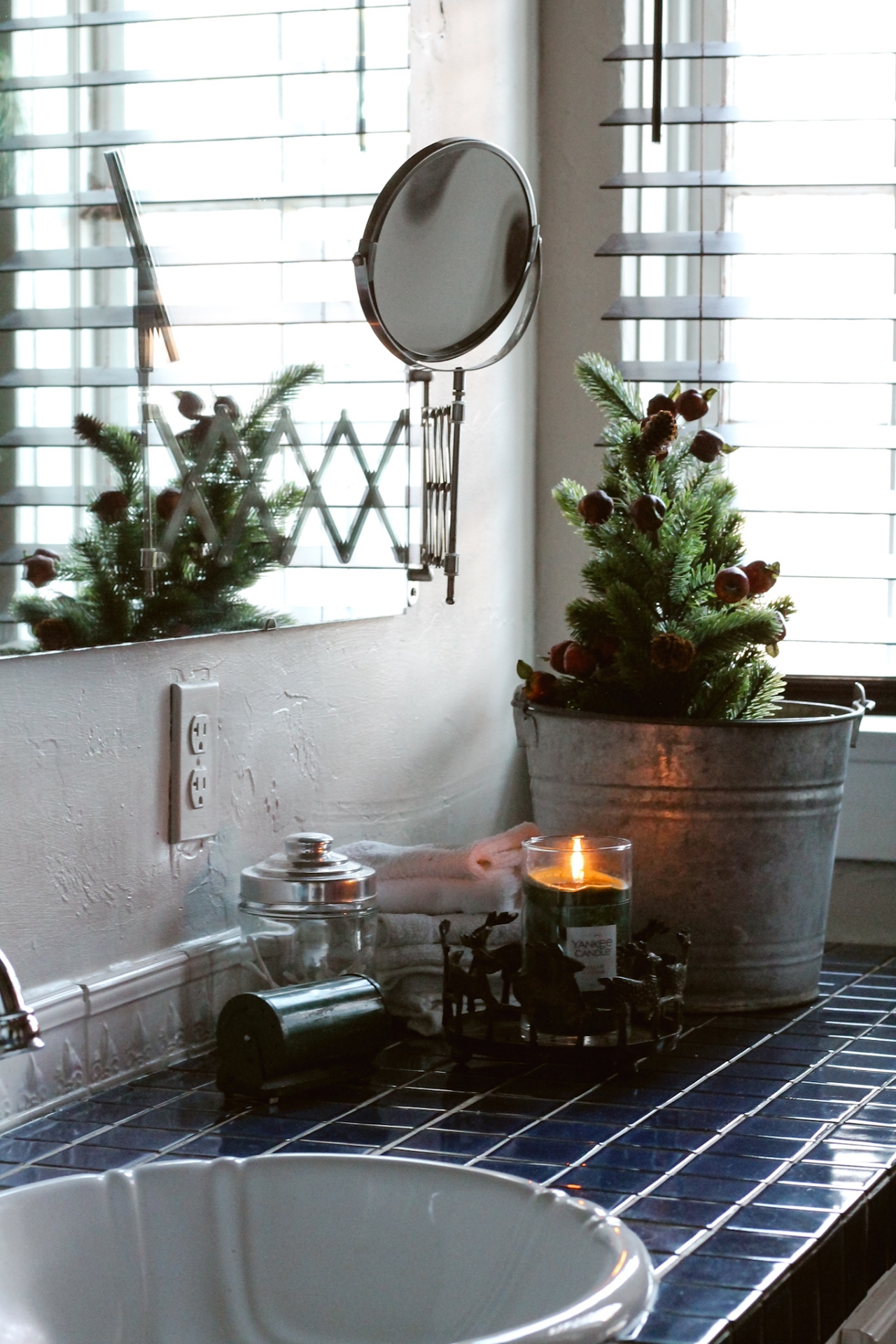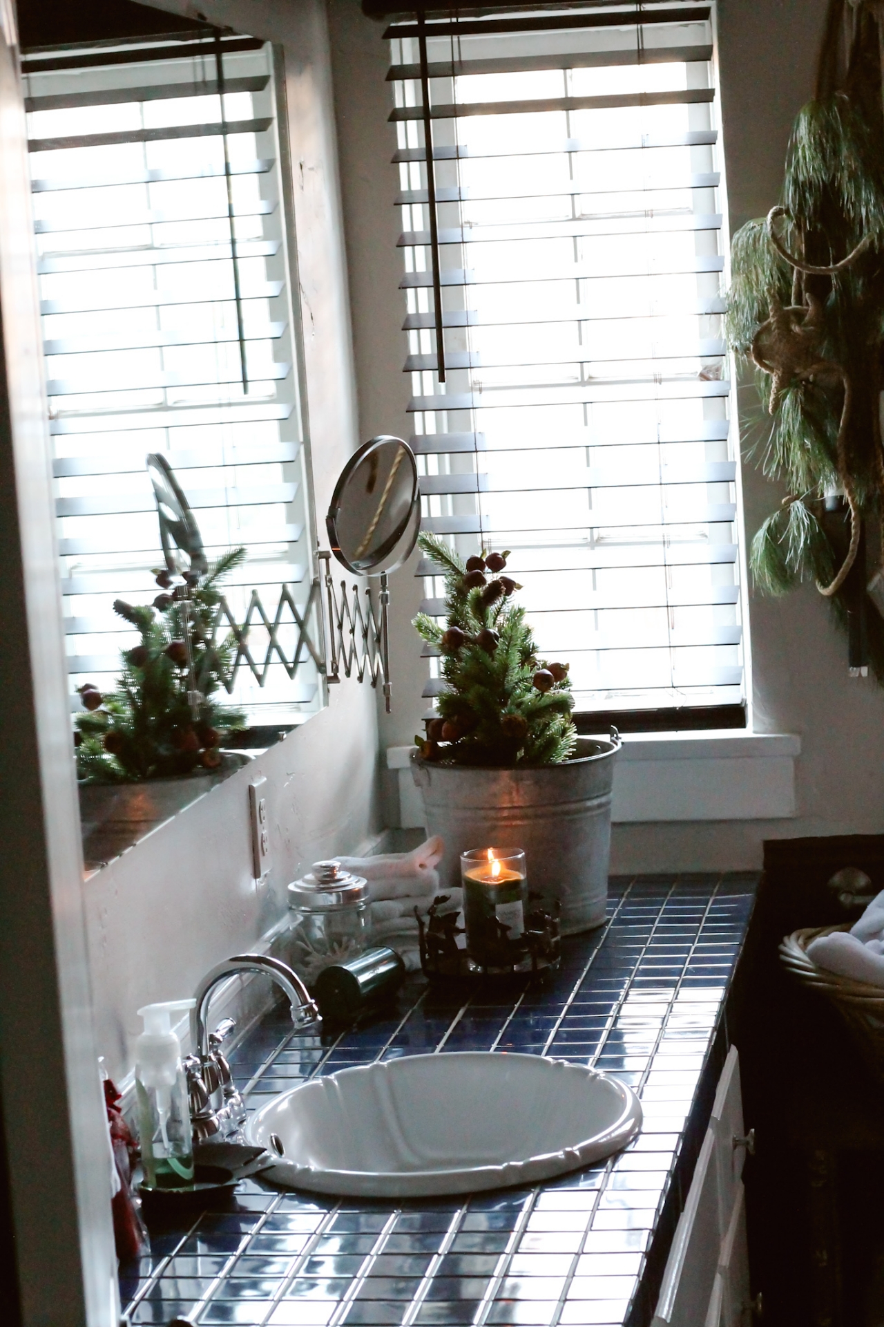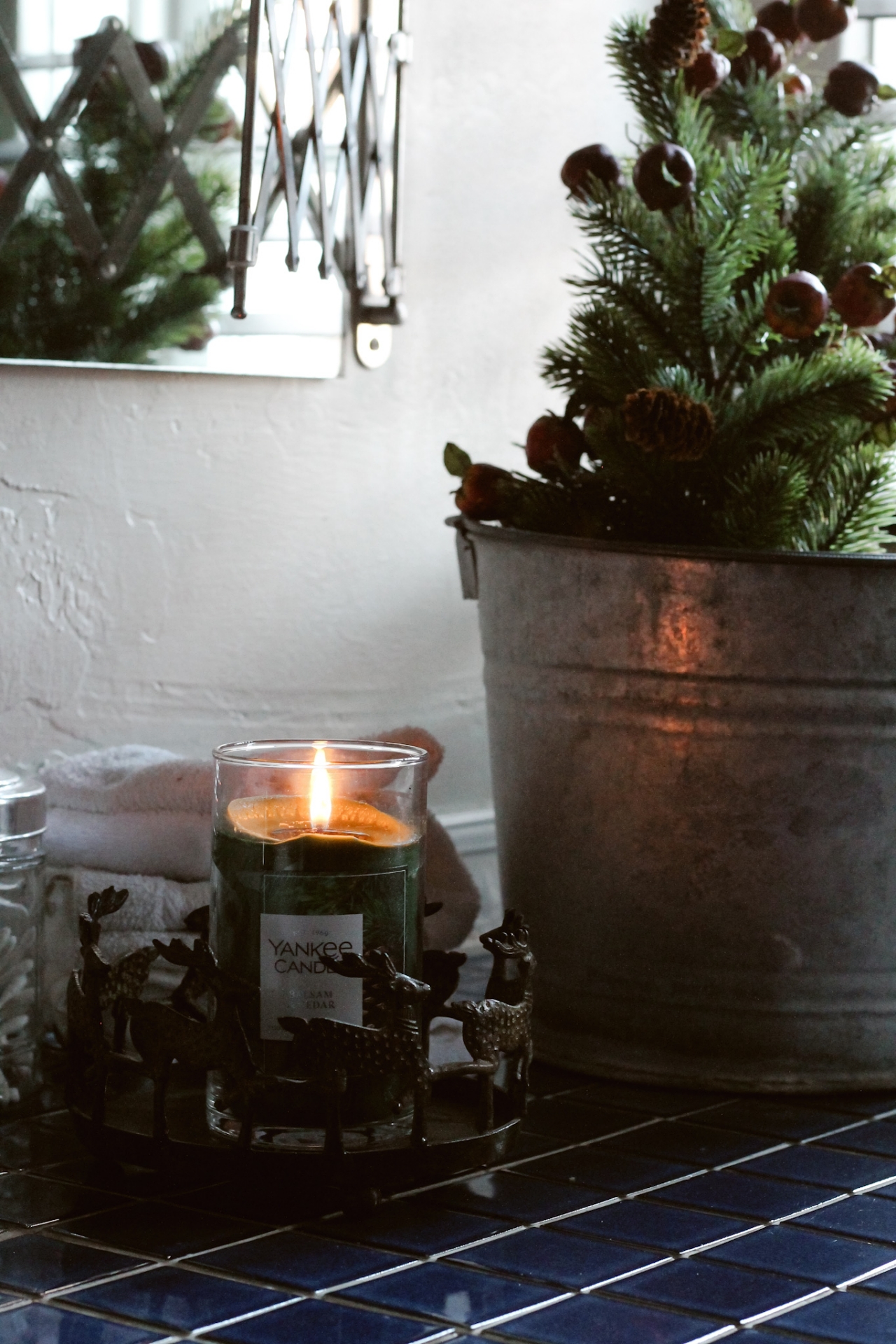 I just plopped a couple of mini trees into a metal bucket, and added a Pine Scented candle to finish up with my Christmas decorating in here. THIS is the candle that I’ve got burning. I Love a good Pine Scented candle and burn it all Winter long.