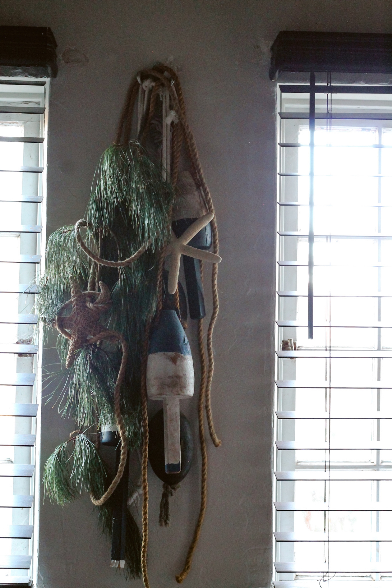 I had these boat buoys hanging up already, but to add a festive look to them, I also added a real pine branch, more rope, and some starfish. This whole thing makes this Sea-Gal so happy. 😀