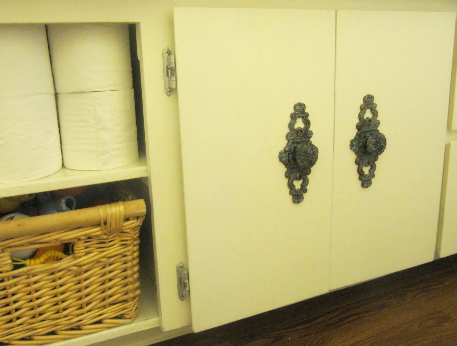 I added the hardware to the cabinet in the bathroom.