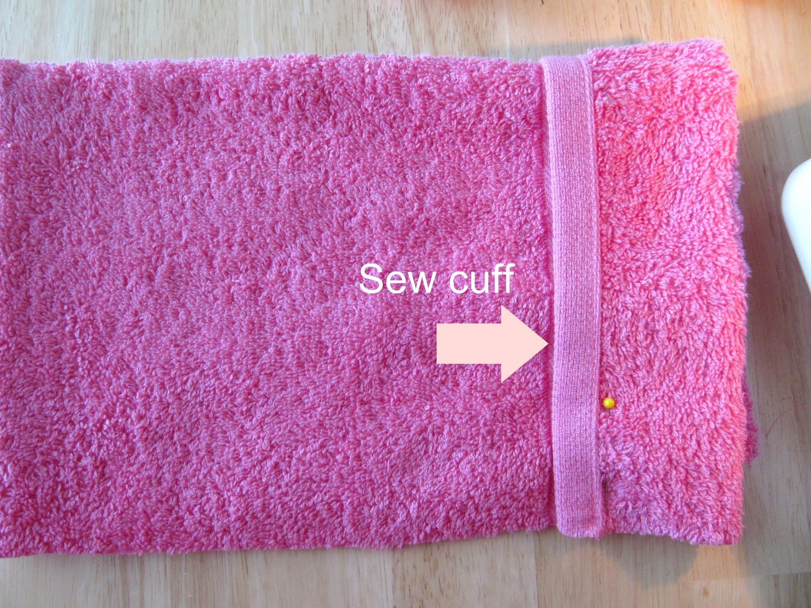 Next you’ll make a cuff by folding over the opposite side of the towel. Pin and sew. This is the part that frames the face. The hood is now complete.