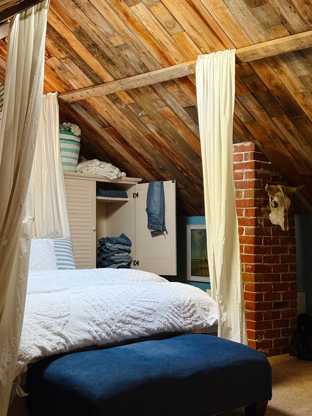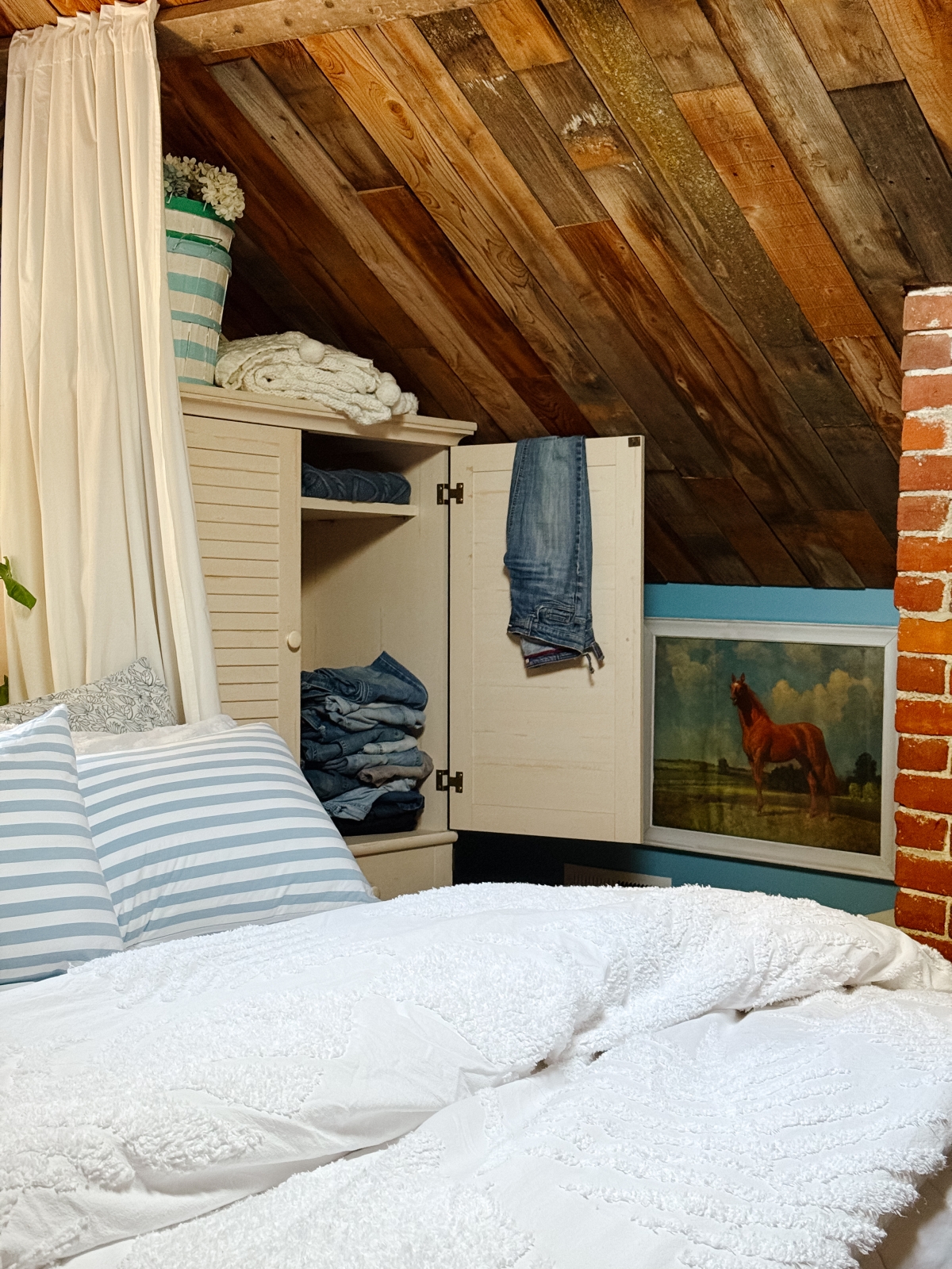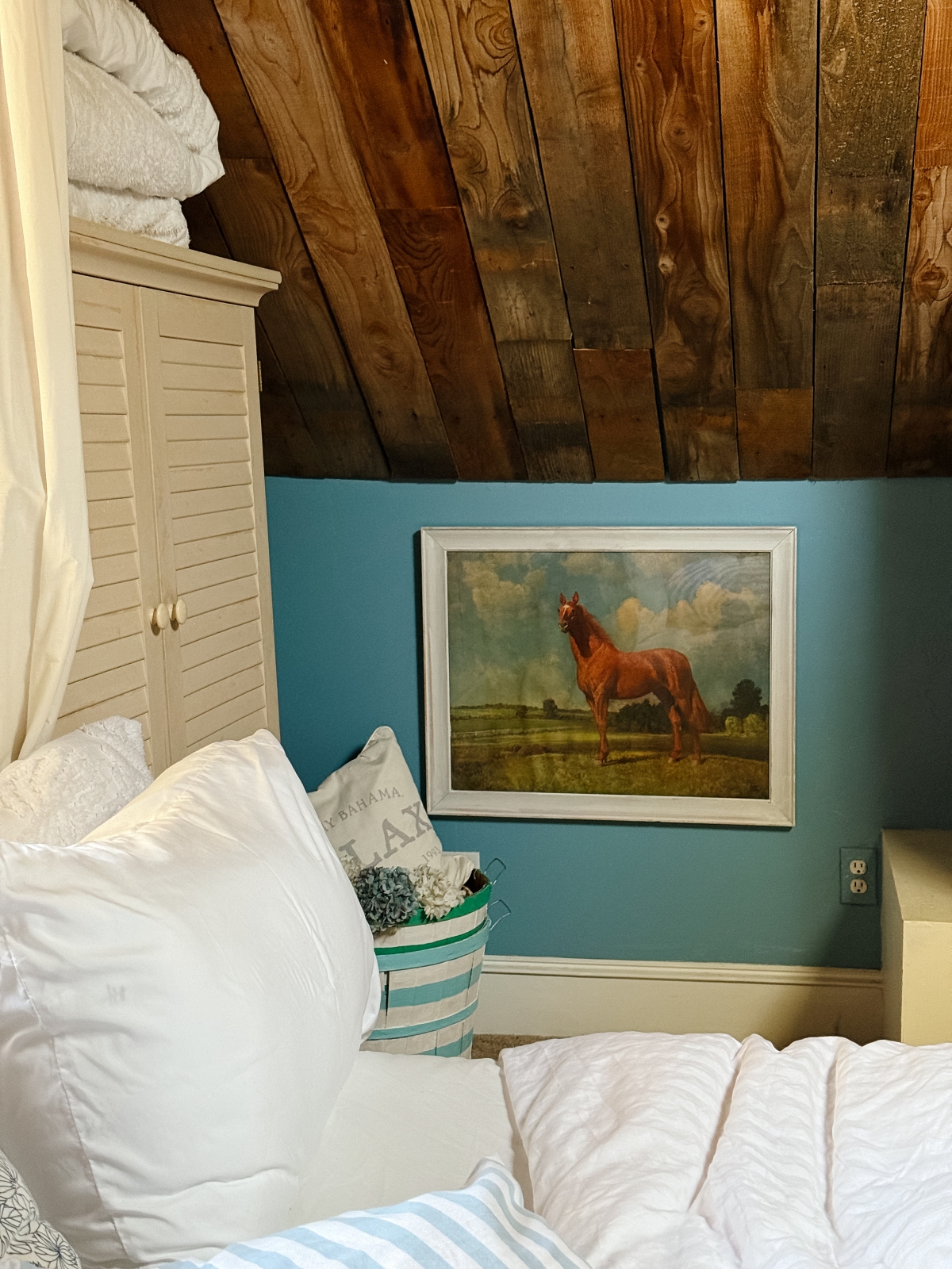 Another look from last summer that I didn’t get a chance to share is in my bedroom. I brought this horse painting into the space and loved how it looks against the wood ceiling and blue walls.
