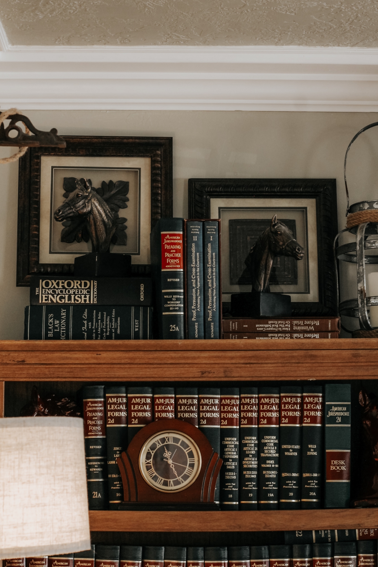Revamped bookshelves with classic horse decor