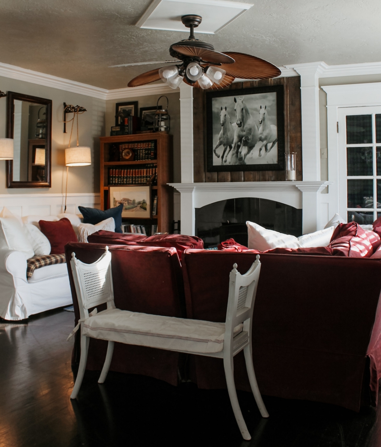 This last look at my bedroom shows how versatile horse decor can be. The space leans more rustic and country, with wood ceilings, a denim ottoman, and a cow skull on the brick chimney. The horse artwork itself has a more relaxed, country feel, while equestrian art often features horses styled for polo or classic hunting scenes.