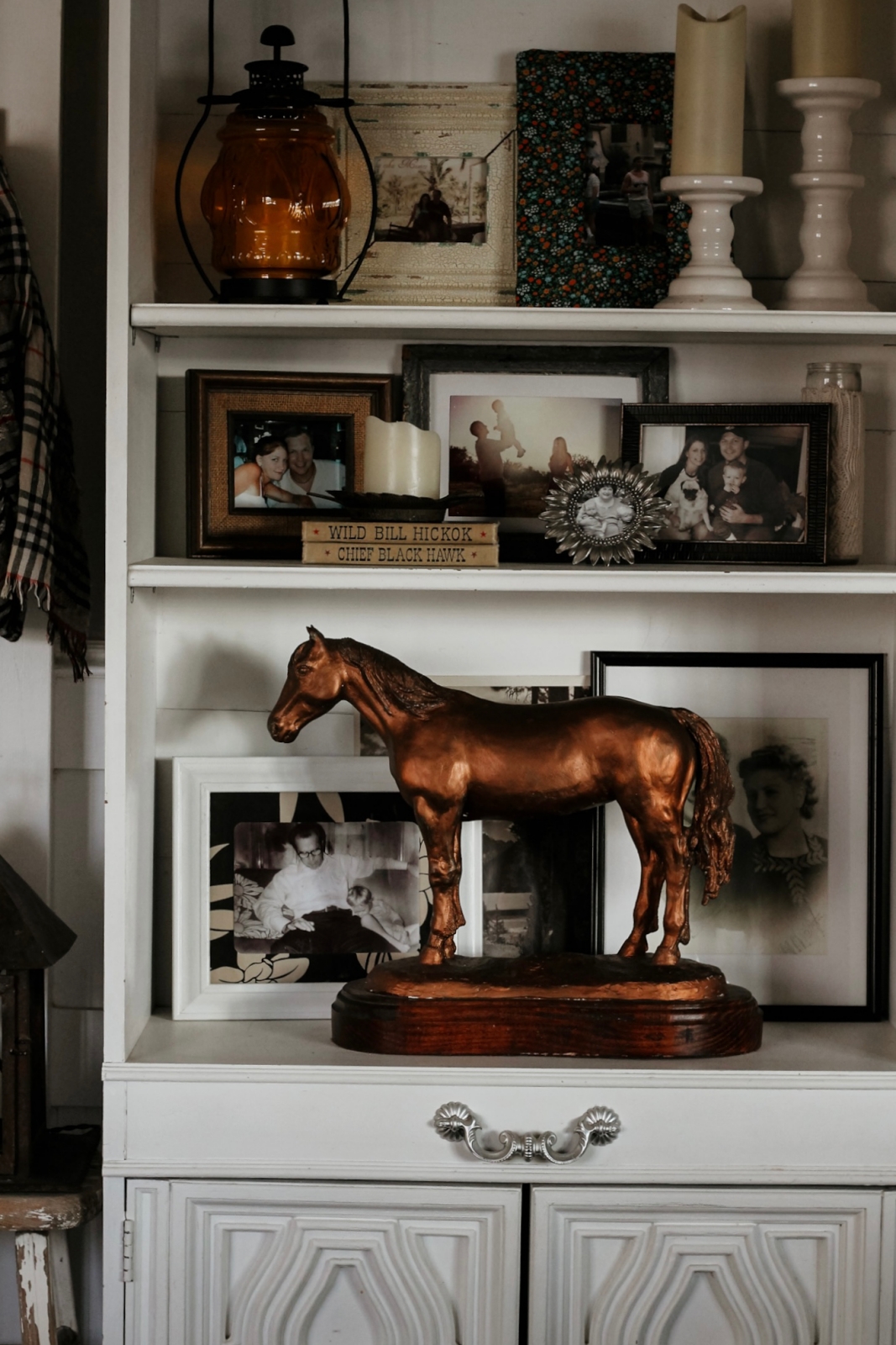 Behind the horse statue sits a framed photo of my husband as a little boy, napping beside his grandpa. It’s one of my favorite pictures and feels especially fitting placed near the horse sculpture. I love incorporating personal photos like this throughout our bookshelves among the decor to make the space feel warm and personal.