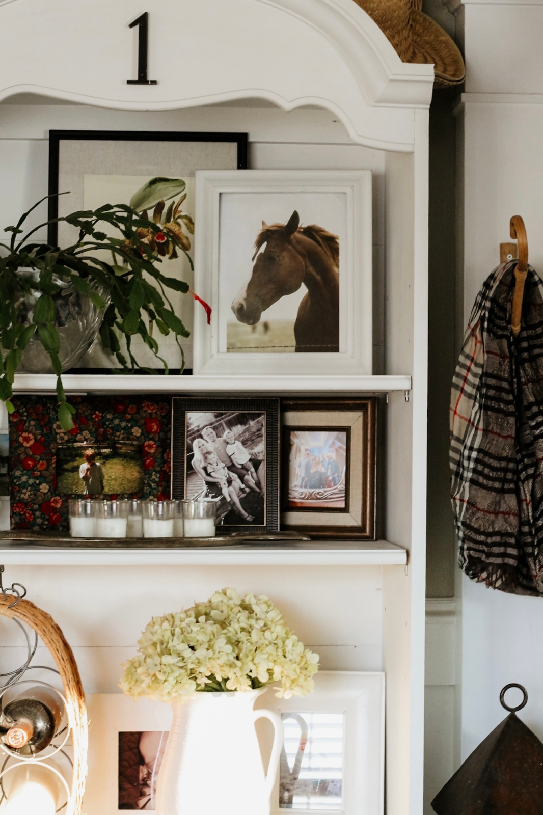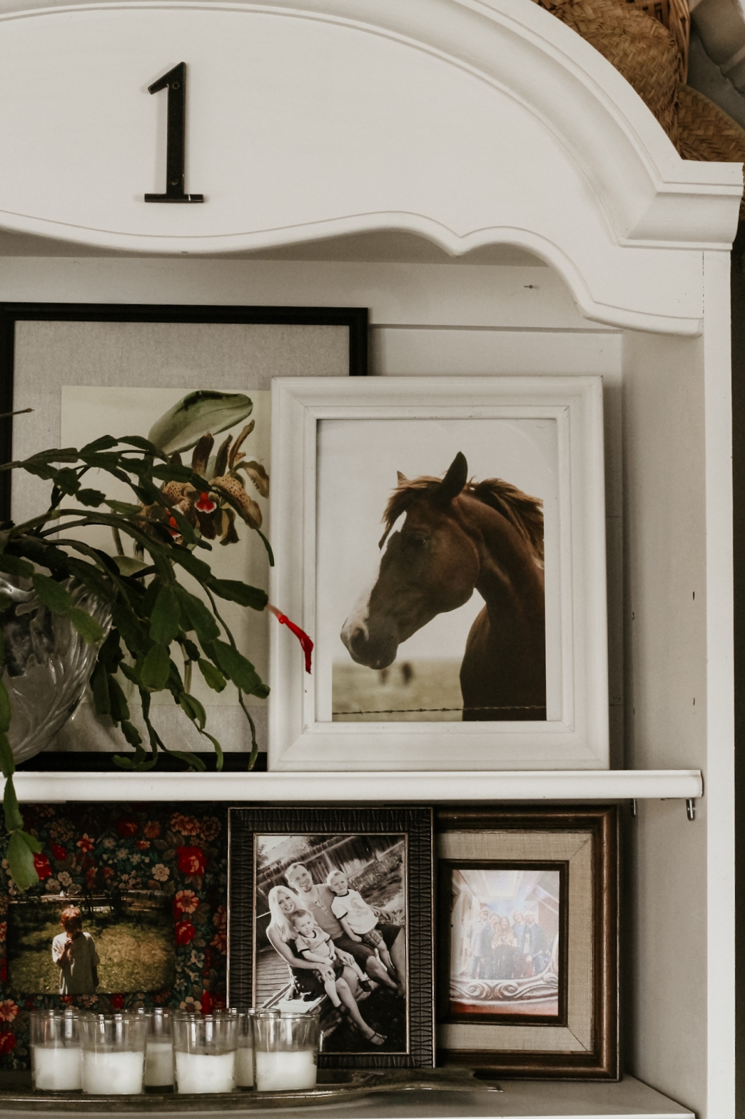 The framed horse artwork on the shelves, along with the tropical flower prints layered behind it, are actually free art I found online. I’ve shared my favorite source for free printable art on the blog before (you can read that post here), It’s a wonderful resource if you’re looking to add art to your home without spending a lot. There are several beautiful horse prints available on the site, which makes incorporating horse decor into your home both easy and accessible. This particular horse portrait caught my eye, and I love the timeless look it adds to our shelves.