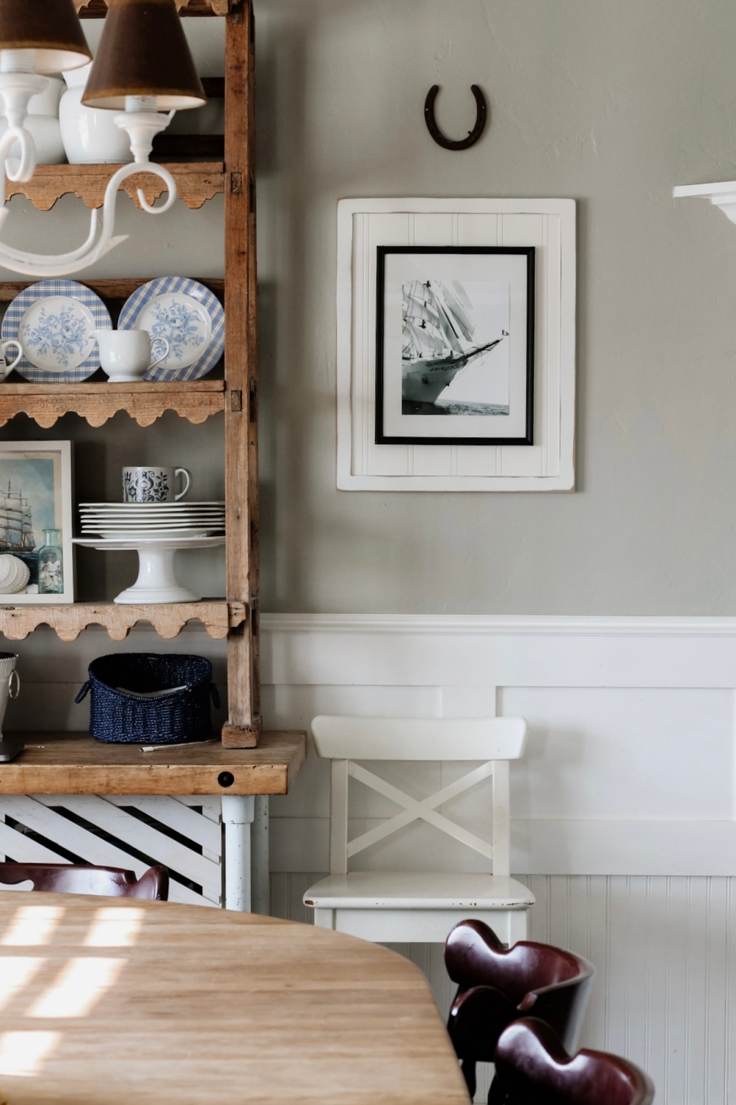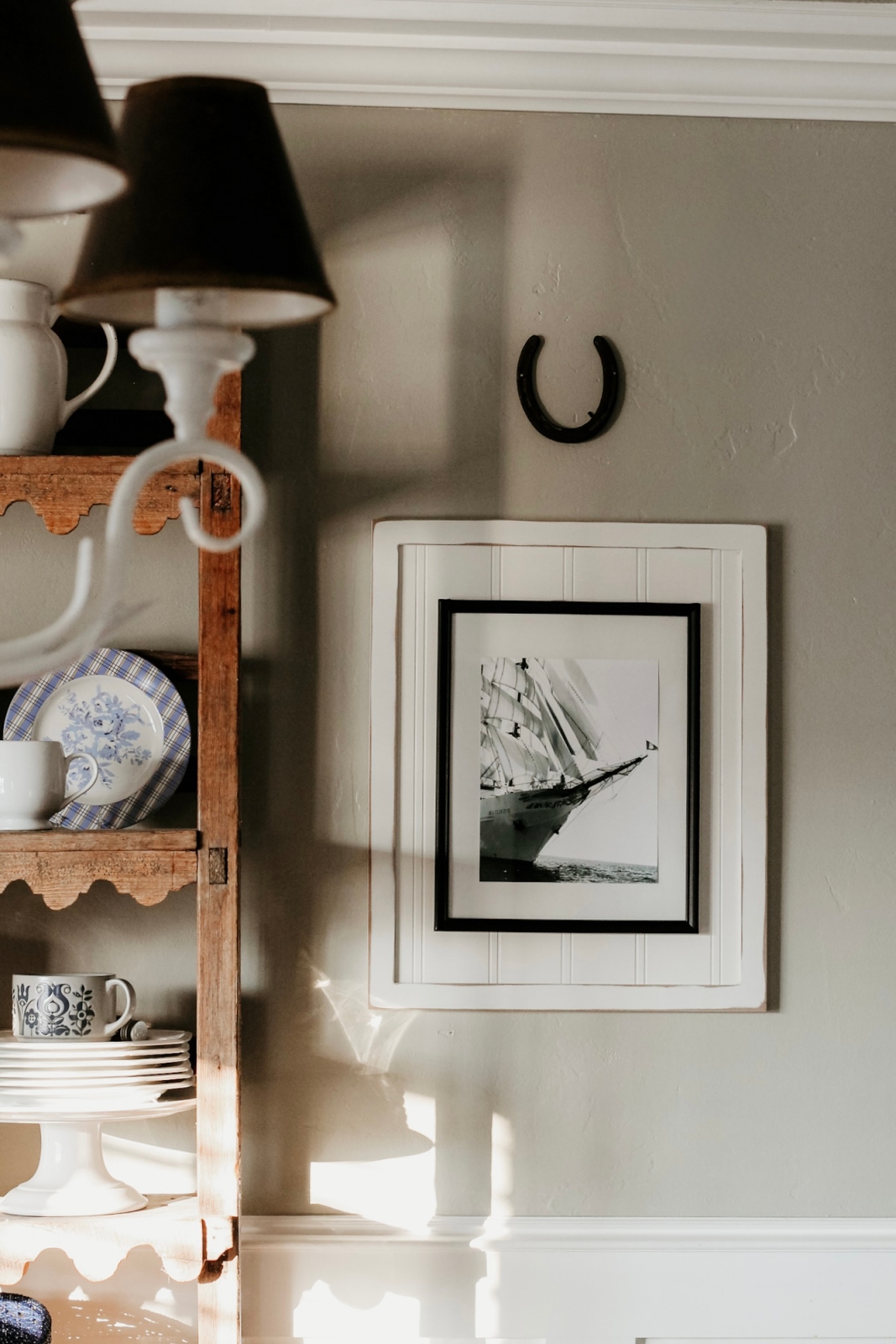 Hanging up in our dining room is a simple horseshoe that adds another subtle equestrian touch to the space. Directly beneath it is a framed black-and-white photograph of a ship, which is also a piece of free art from the same source I mentioned earlier. Since the dining room shares space with the bookshelves, this small nod helps carry the horse decor seamlessly throughout the room.