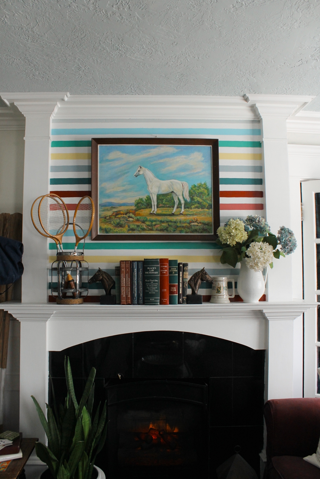 I didn’t get a chance to share this last summer, but I painted colorful stripes on our mantel and added this horse painting. Vintage badminton racquets, stacks of old books, a graduation stein, and a vase of hydrangeas completed the look, giving the mantel a fun, preppy summer feel.