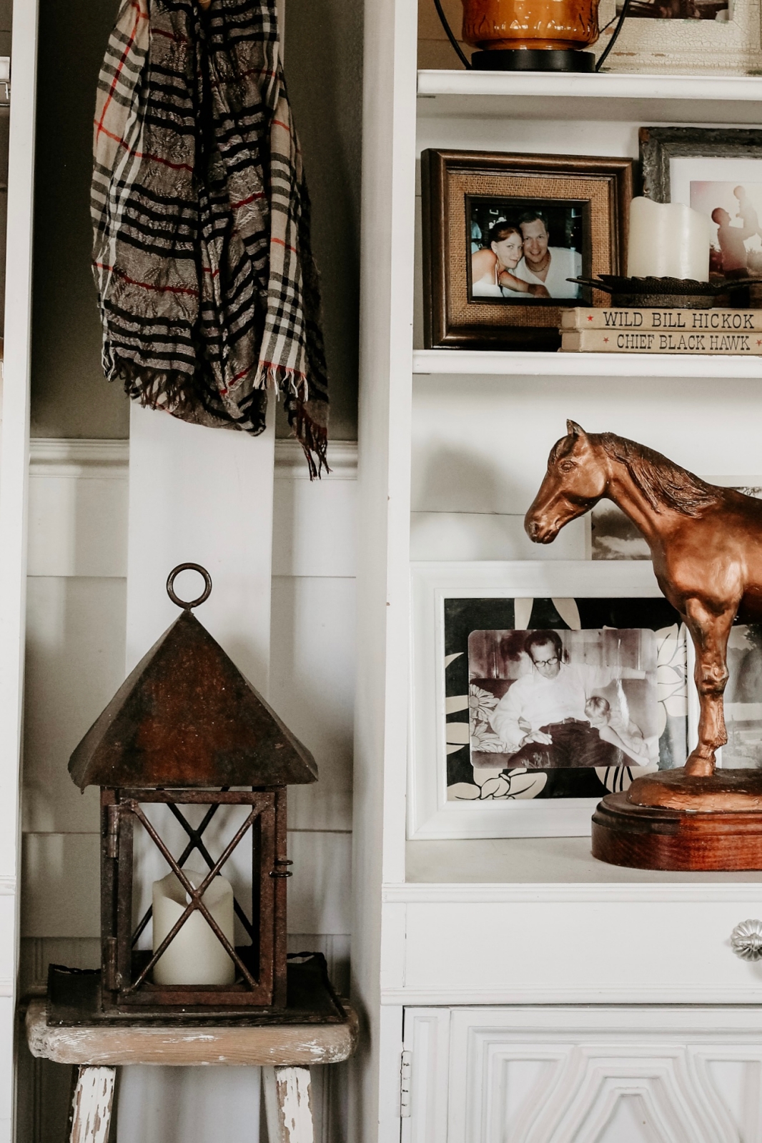 Lastly, between the two bookshelves sits an old chippy white stool topped with a rustic metal lantern. I’m not entirely sure why, but this lantern has always felt very equestrian to me. Hanging above it is a Burberry check scarf, which adds a classic English, equestrian-inspired touch and ties the whole vignette together beautifully.
